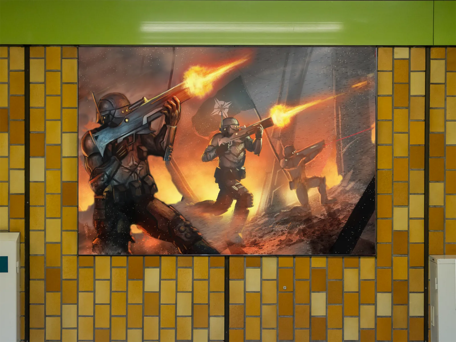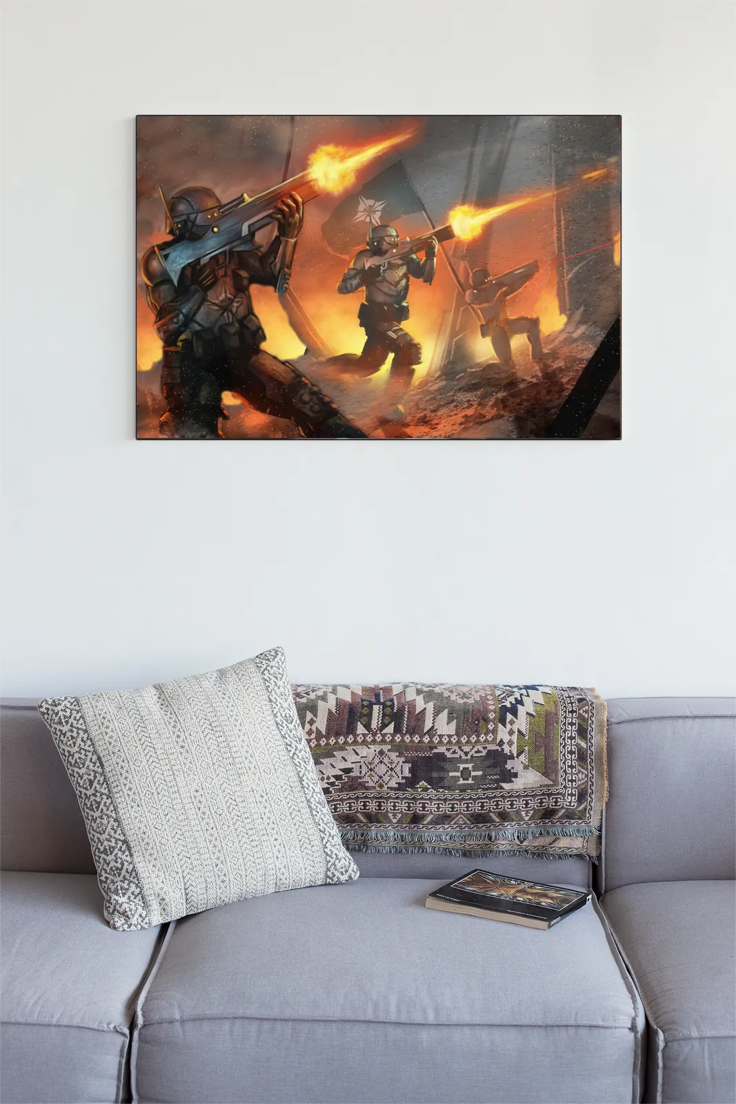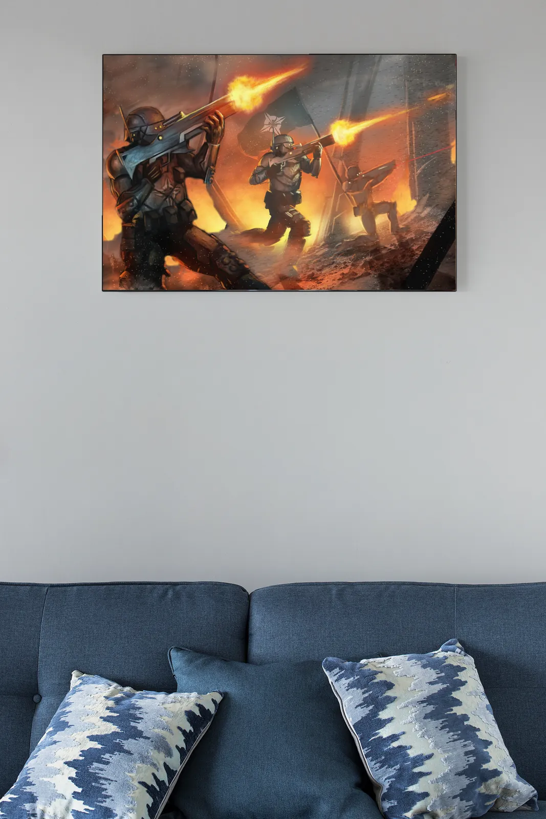 Above all, this artwork speaks to collectors and tabletop fans drawn to military sci-fi themes, working effectively in a game room, creative studio, or dedicated wall display where action-driven imagery defines the atmosphere.