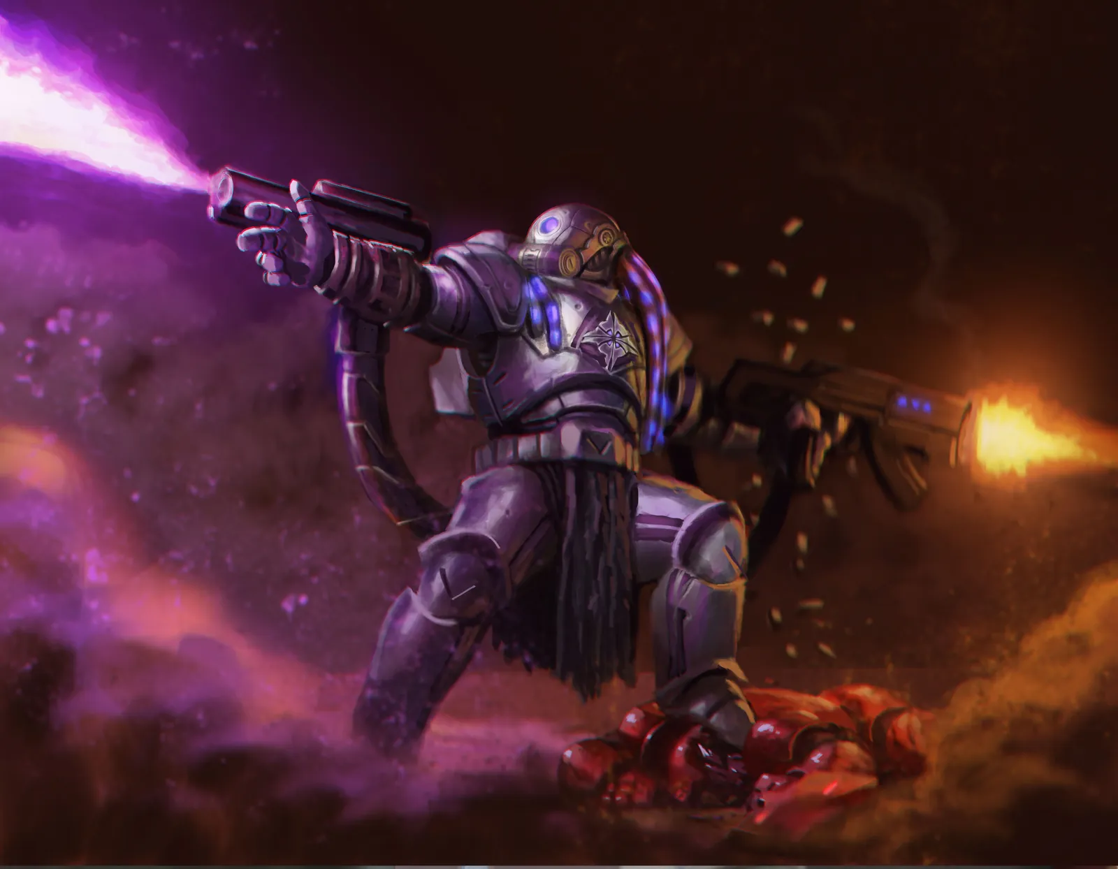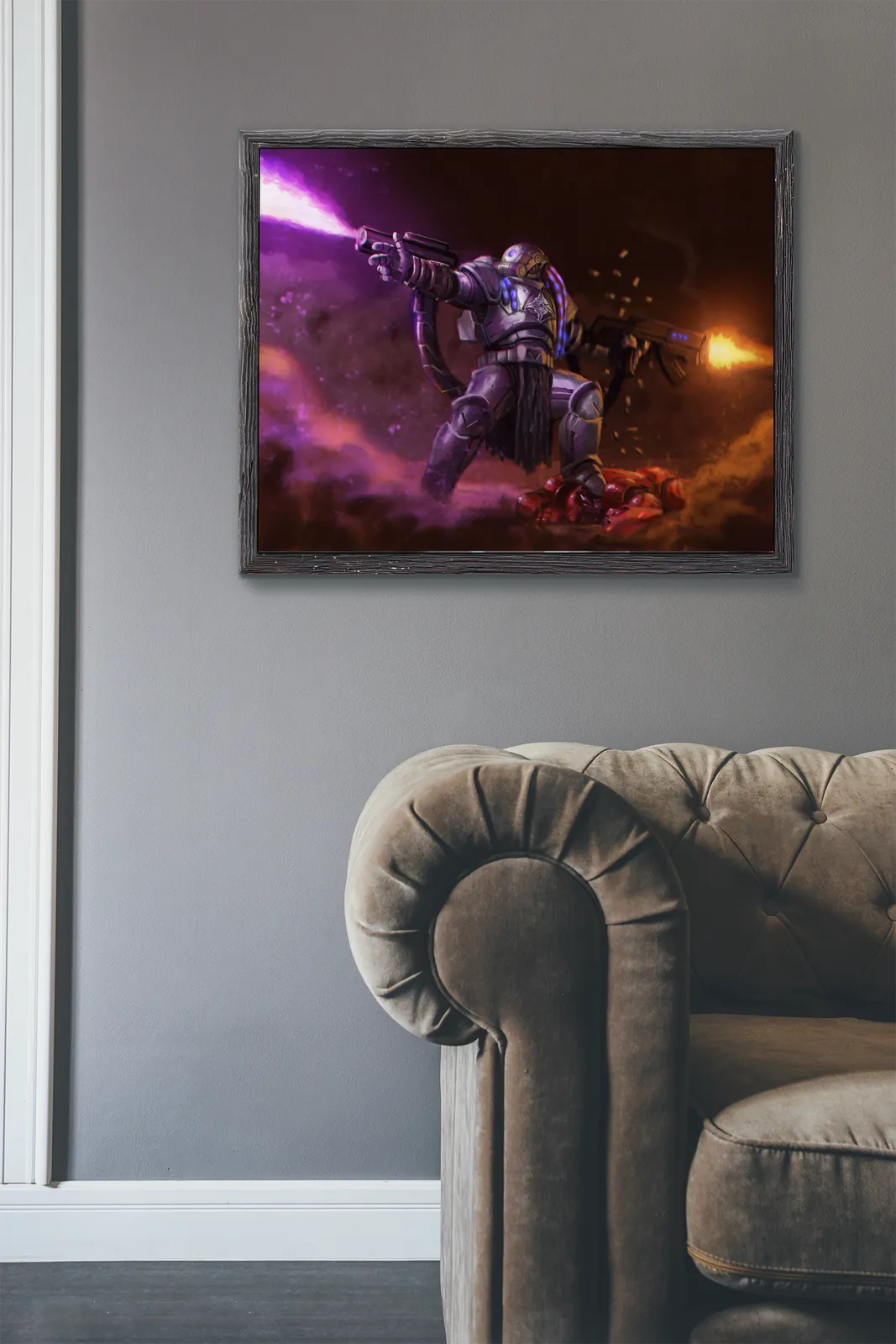 ORWAR charges into battle as twin weapons erupt with fire and energy. This moment establishes orwar canvas art through motion, impact, and control. Moreover, the armored warrior braces forward while violet plasma splits the smoke.