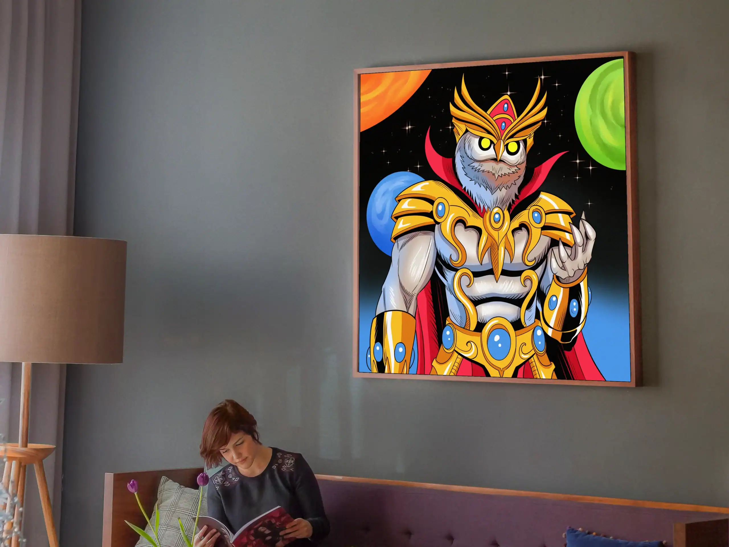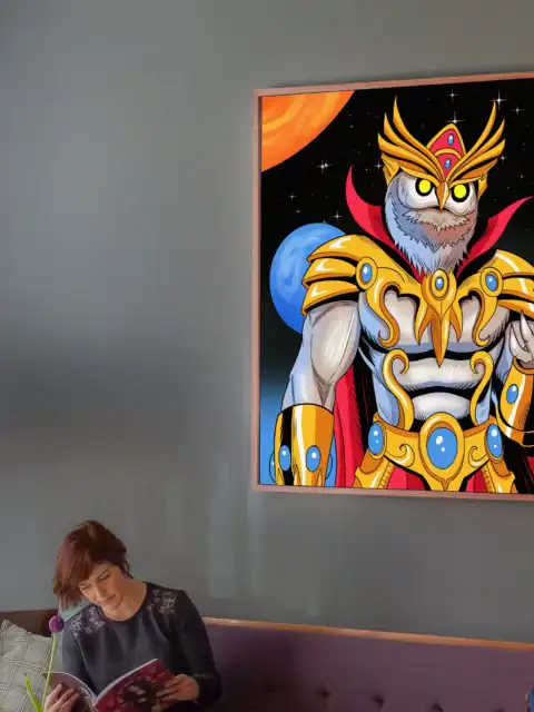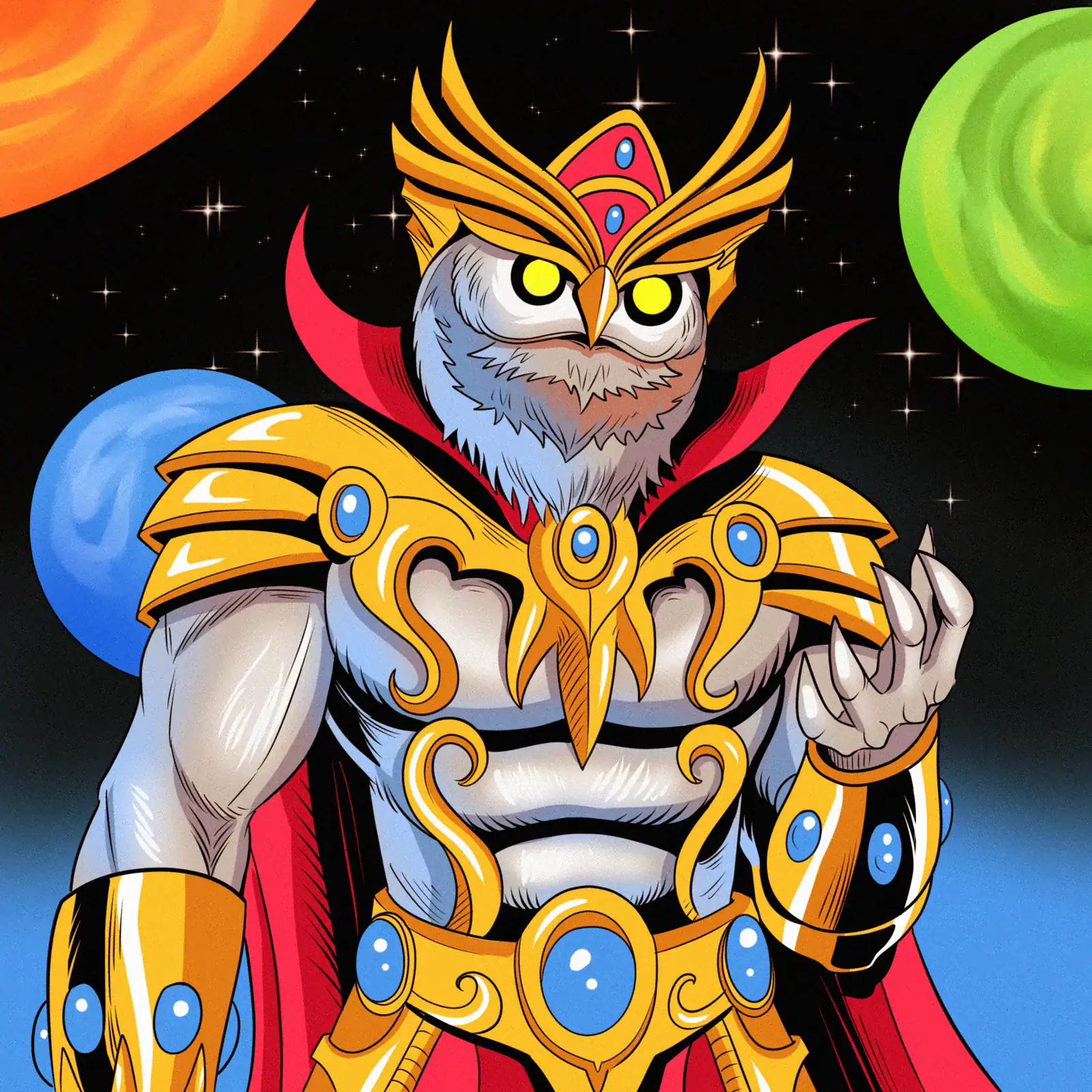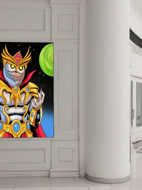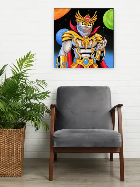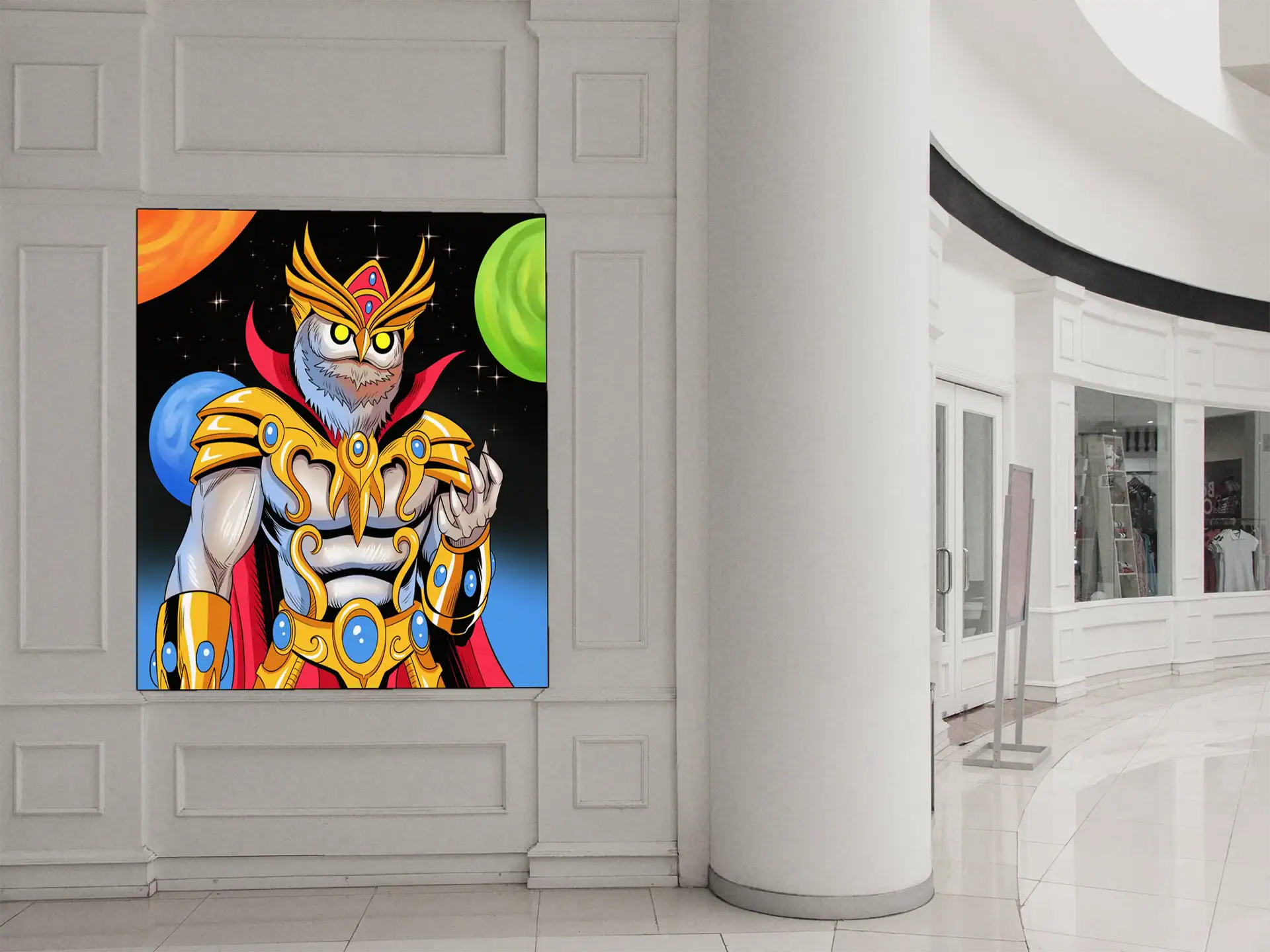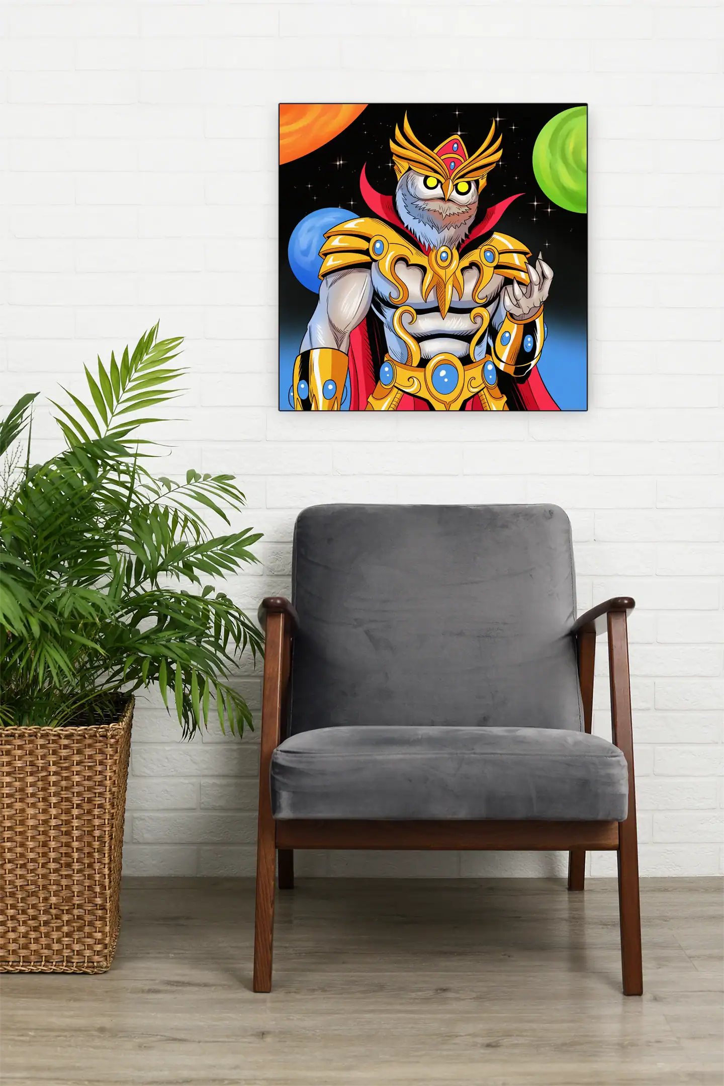 An armored owl deity commands cosmic space with piercing yellow eyes. This owl god art trading card canvas print showcases Fabricio Vainer’s signature retro style. Notably, golden armor gleams against the starlit void backdrop.