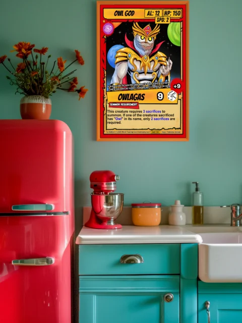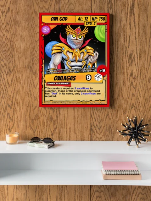 At room scale, the bold linework and high-saturation colors read clearly across any game room or collection wall. This owl god trading card canvas print speaks directly to Ward TCG collectors building character-focused displays. The 048/150 numbering and 1st Edition mark authenticate the Gen 3 card design.