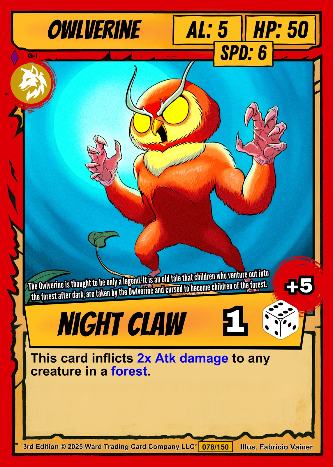 Moreover, the yellow header displays clear stats while red border elements frame the composition. The lower text box contains lore details and Night Claw ability mechanics. Additionally, dice icons and red modifier circles complete the authentic card layout.
