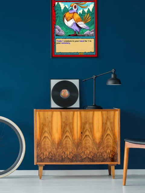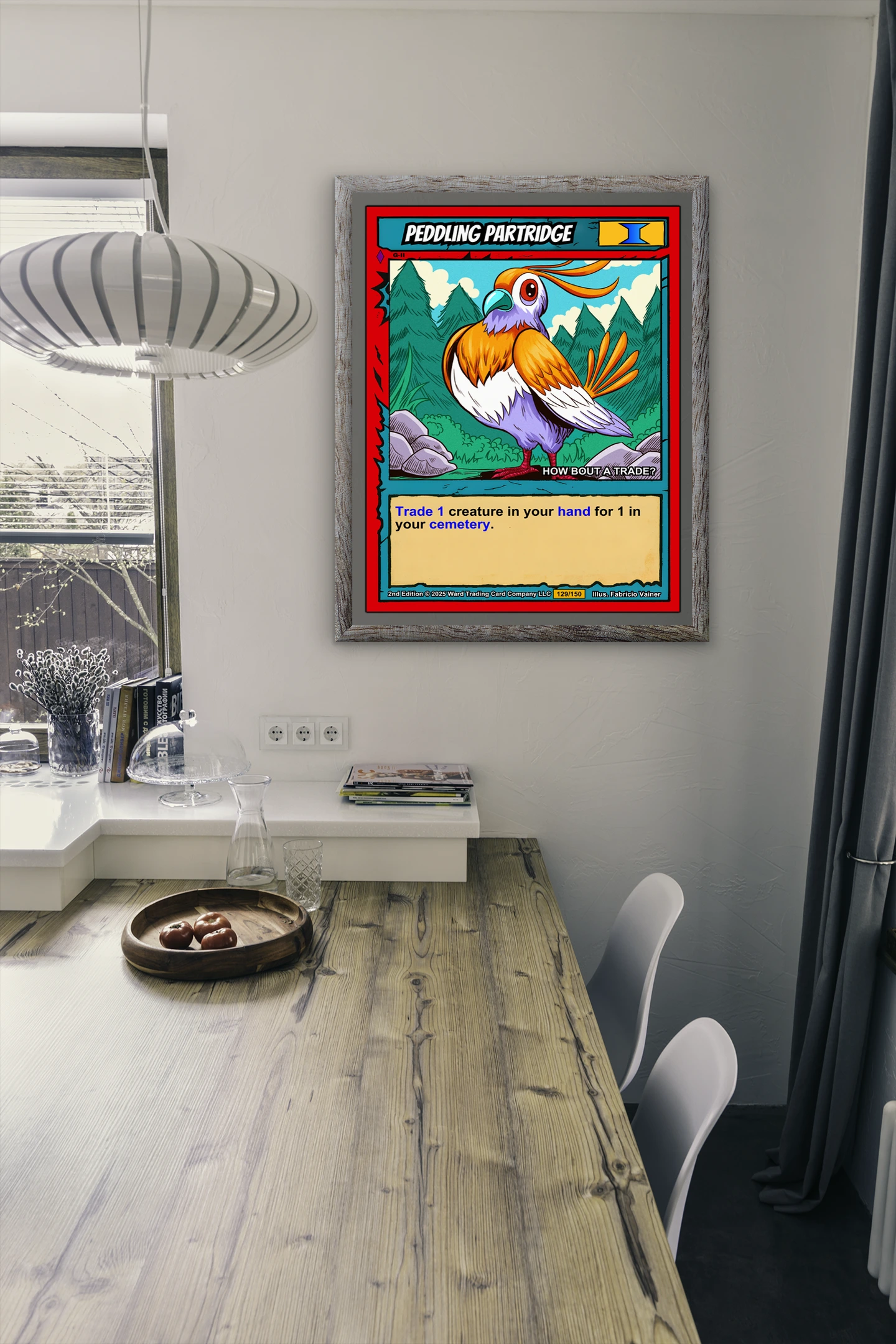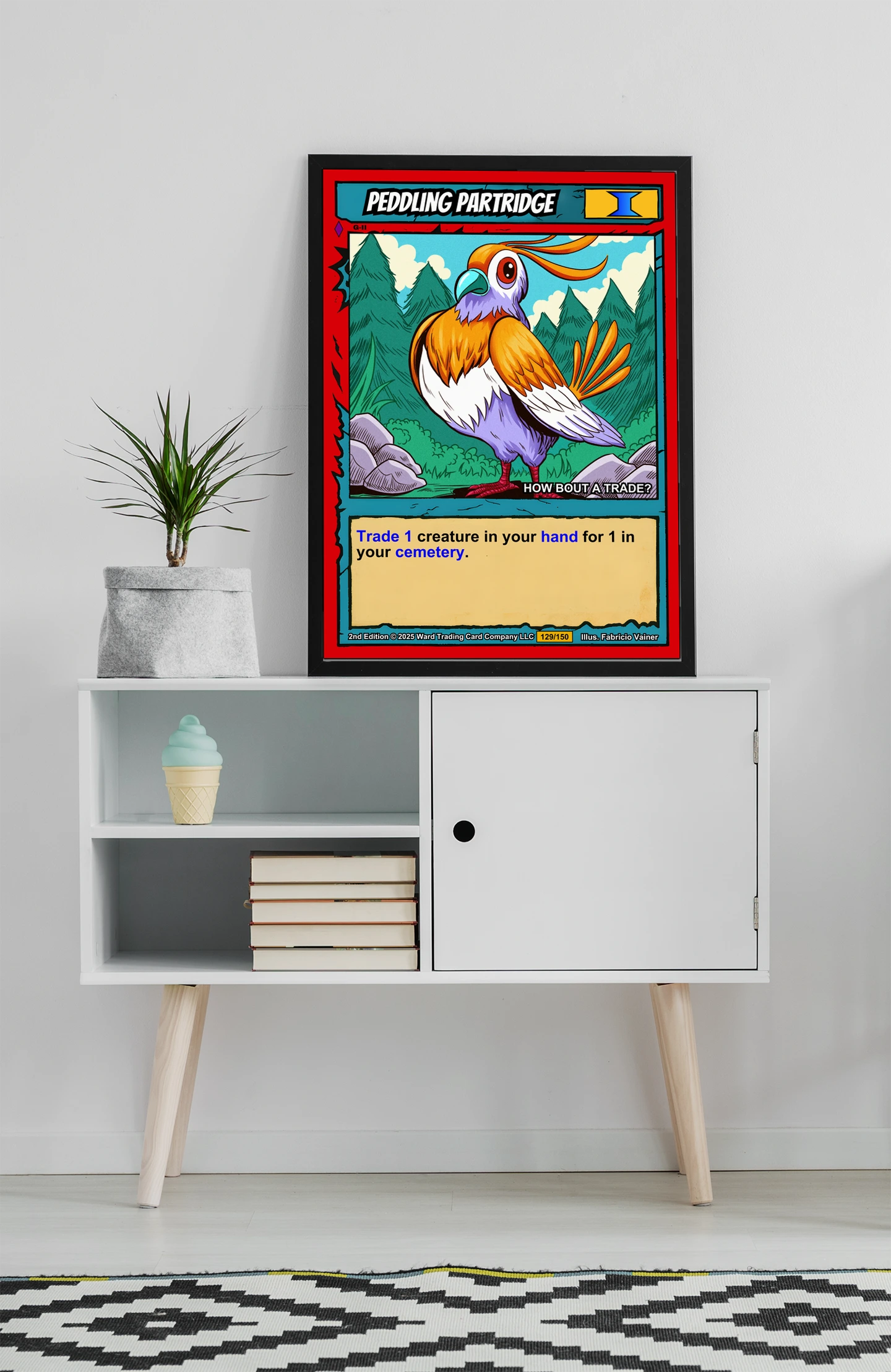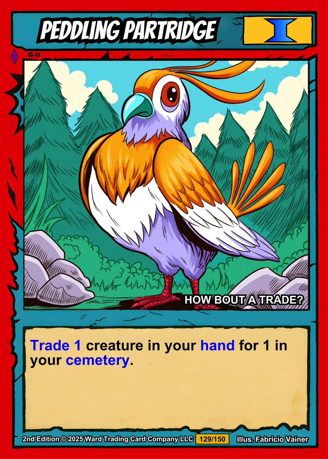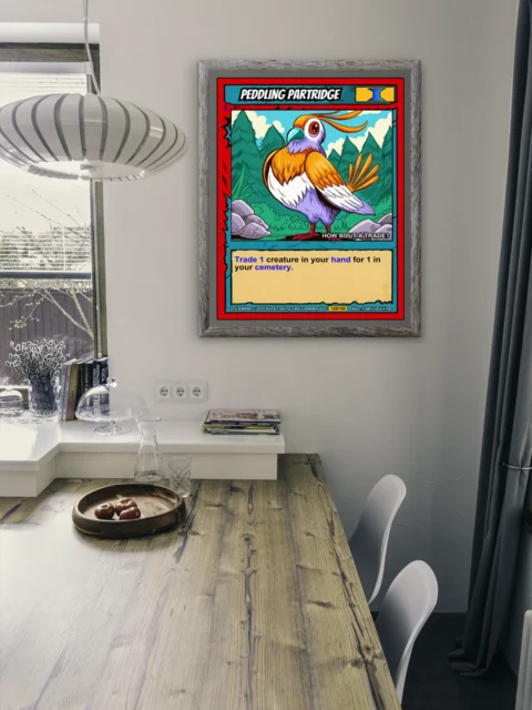 Peddling Partridge Fantasy Canvas Print from Ward TCG: A friendly partridge merchant asks ‘HOW BOUT A TRADE?’ against evergreen forest and rocky ground in bold cel-shaded style.