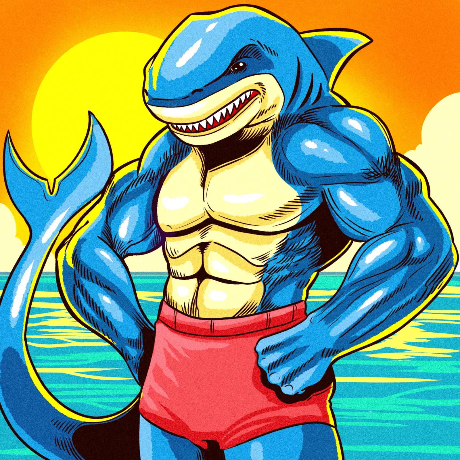 A muscular anthropomorphic shark flexes with exaggerated bodybuilder proportions and a menacing grin. This perfect shark art trading card art canvas print showcases Fabricio Vainer’s bold comic book rendering. The cross-hatched abdominal definition, notably, creates depth through pure ink hatching technique.