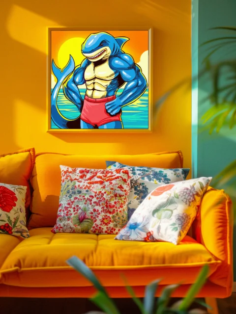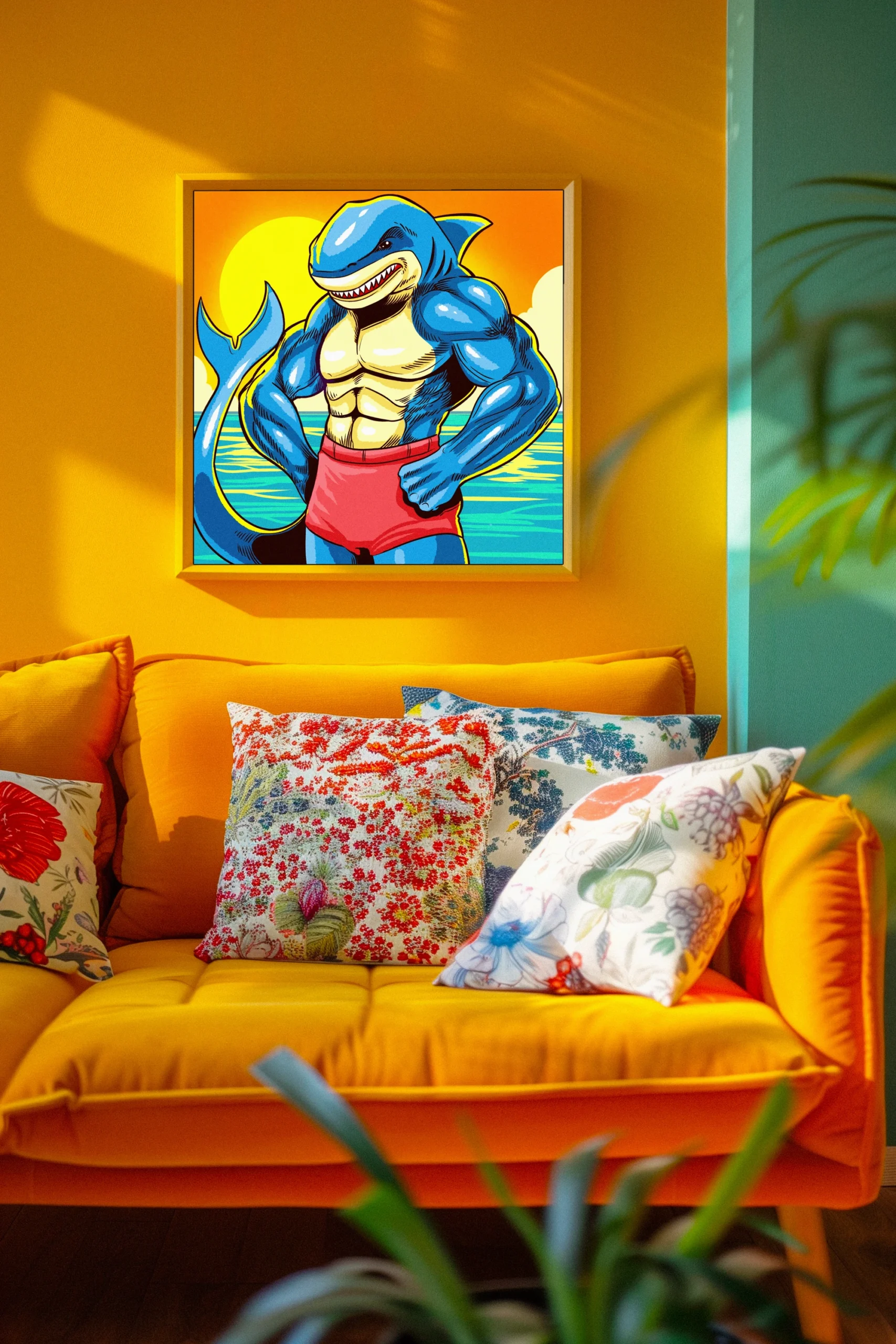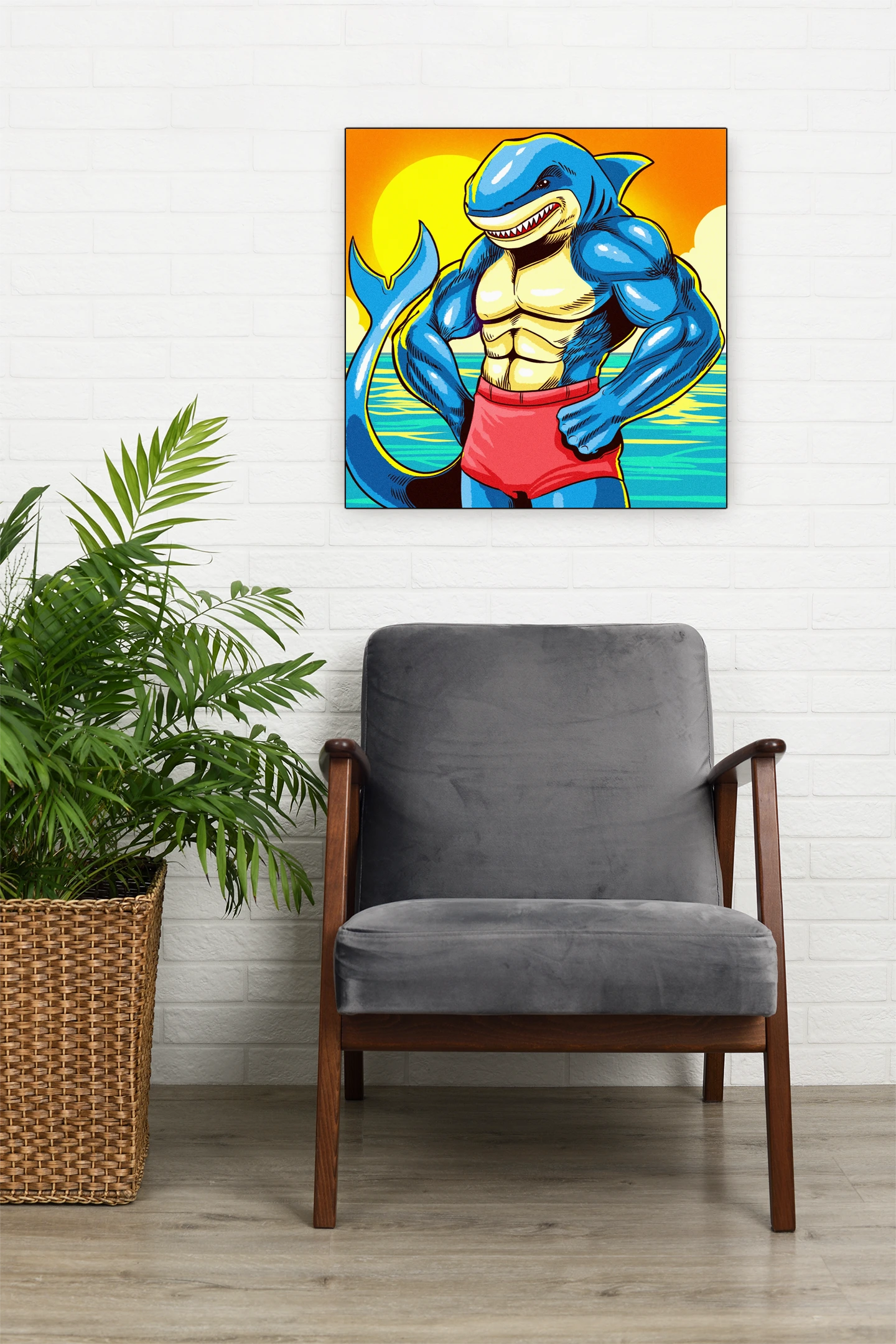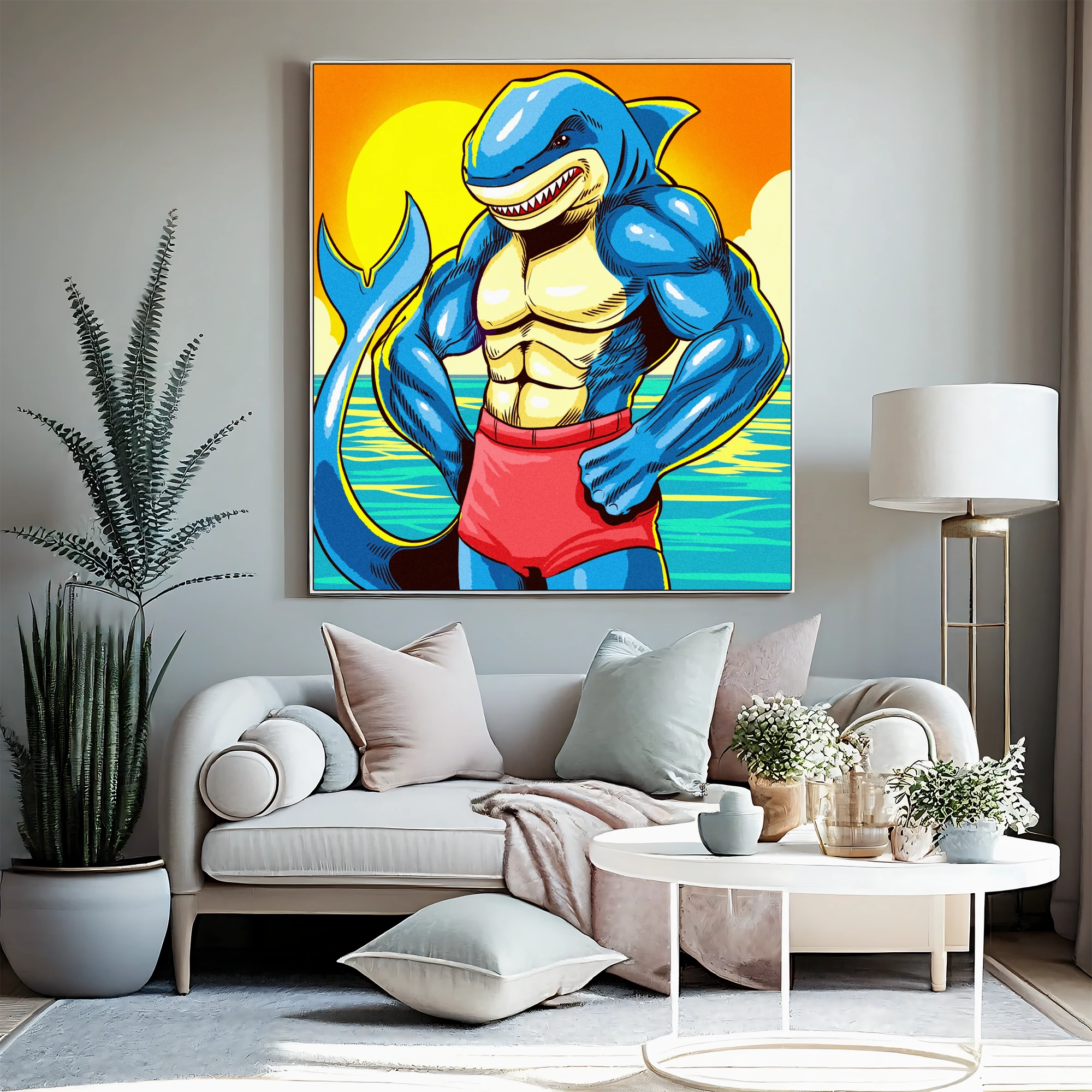 Game room walls gain immediate personality from the playful bodybuilder shark against tropical scenery. Additionally, the piece pairs well with other high-saturation pop art or retro cartoon collections.