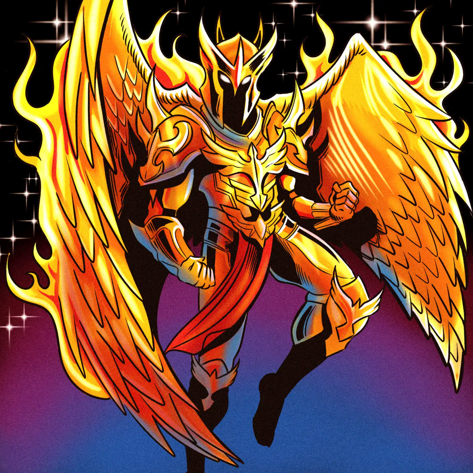 What is more, yellow flames spiral upward from the warrior’s entire form in classic cel-shaded technique. White starbursts punctuate the dark celestial background, moreover creating depth. Bold red cloth accents break the golden armor’s dominance.