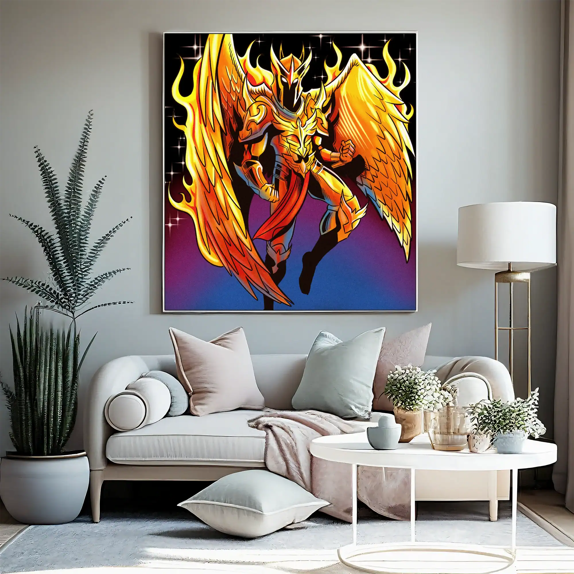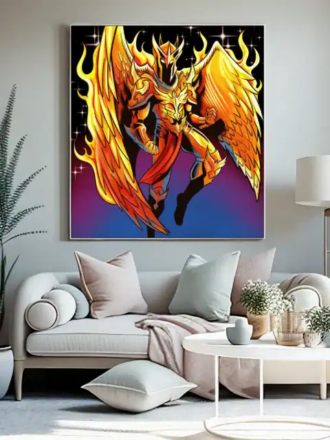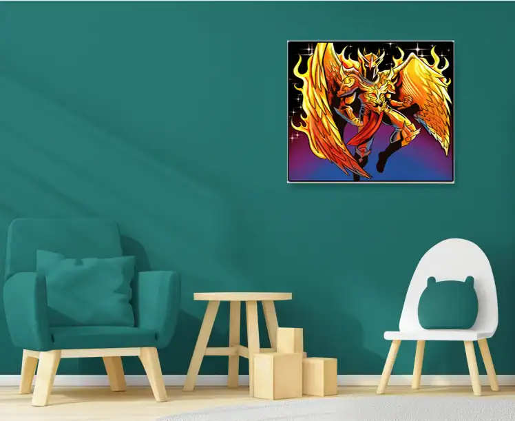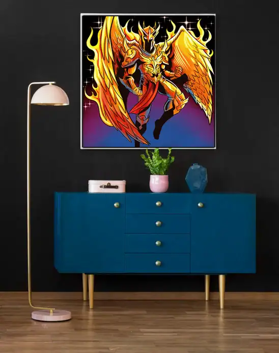 A golden-armored phoenix warrior spreads flame-wreathed wings against a starlit sky. Fabricio Vainer’s phoenix armour art trading card canvas print captures Ward TCG’s signature style. The character’s aggressive helmet crest gleams, particularly against purple-to-blue gradients.