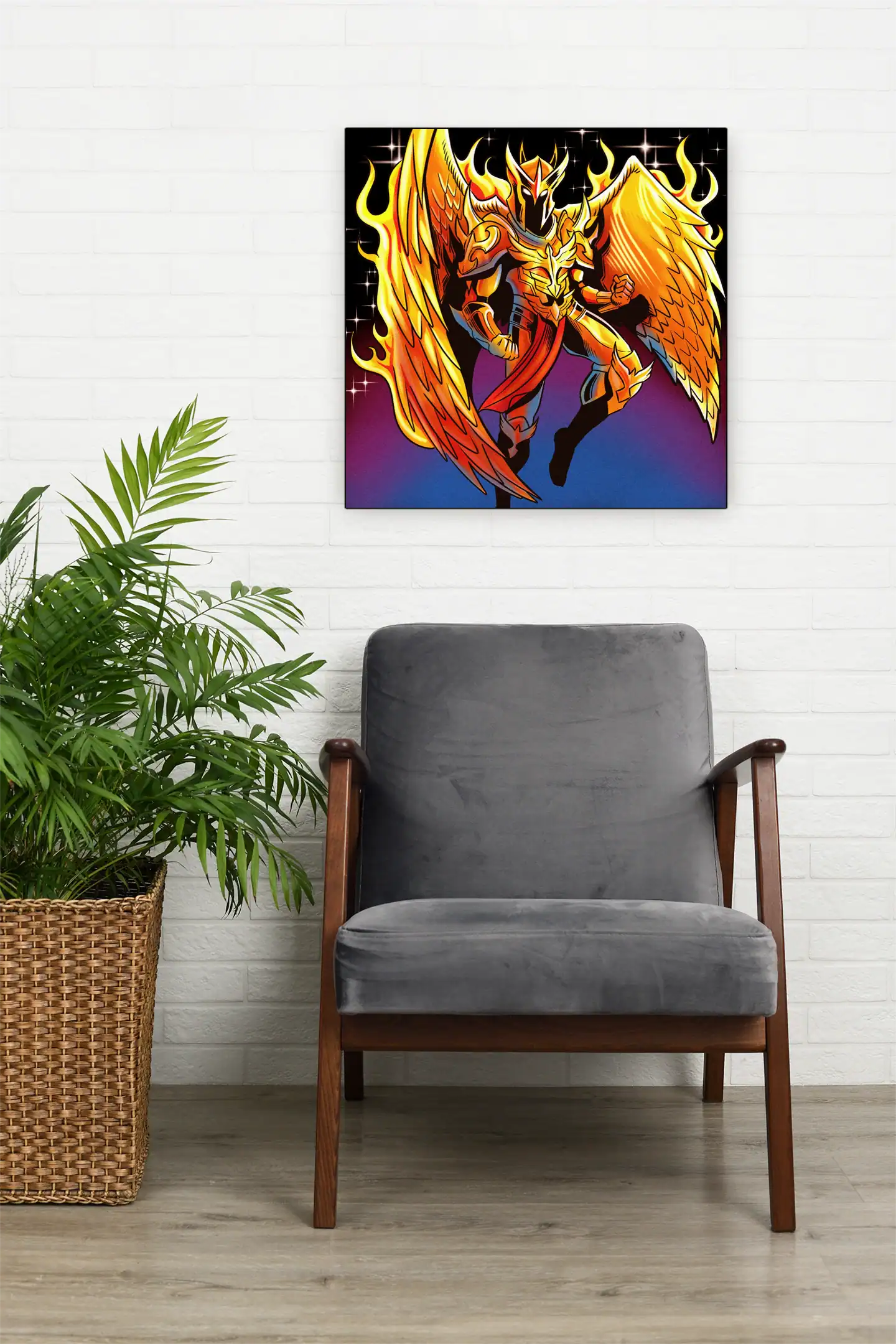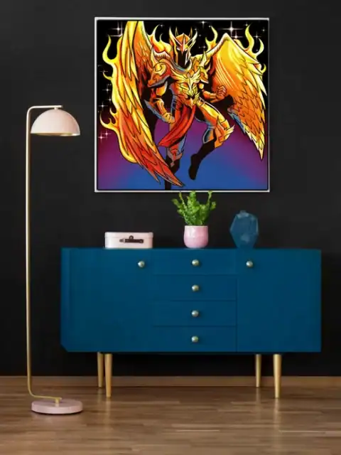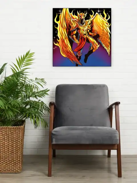 The aggressive angular helmet design marks this as serious fantasy warrior art. TCG collectors recognize Vainer’s distinctive 1990s comic influence and bold color choices. This phoenix armour art trading card canvas print commands attention, particularly in gaming spaces.