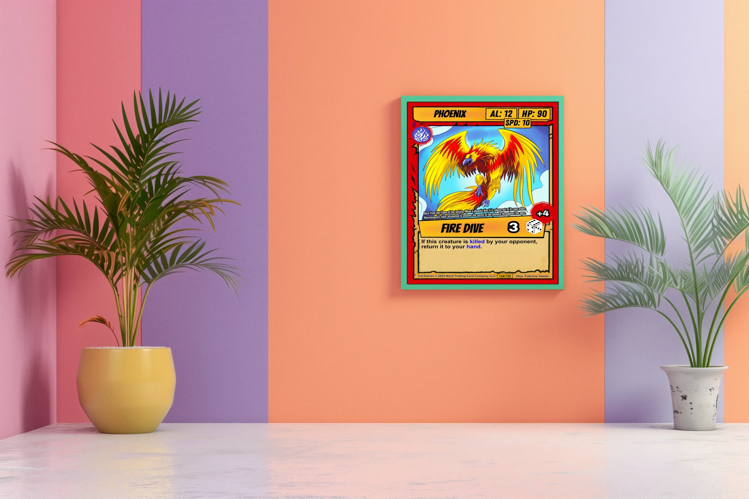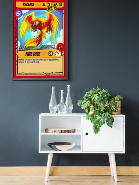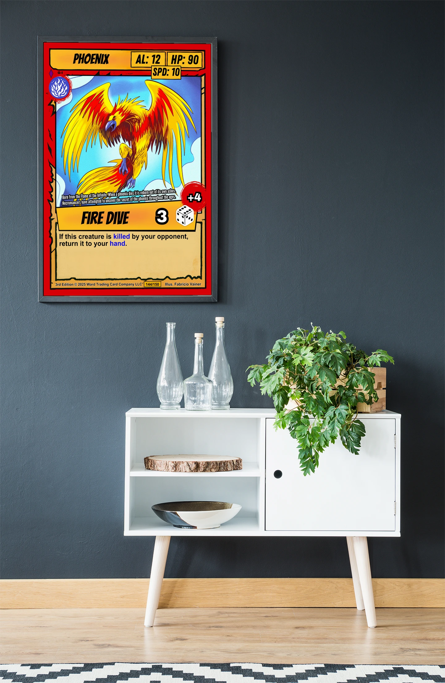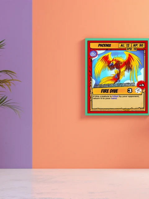 Phoenix encounters demand presence that matches their legendary status in campaigns. Ward TCG collectors recognize cards that capture mythical power through authentic artwork. Particularly, this phoenix trading card canvas print brings that Fire Dive energy home.