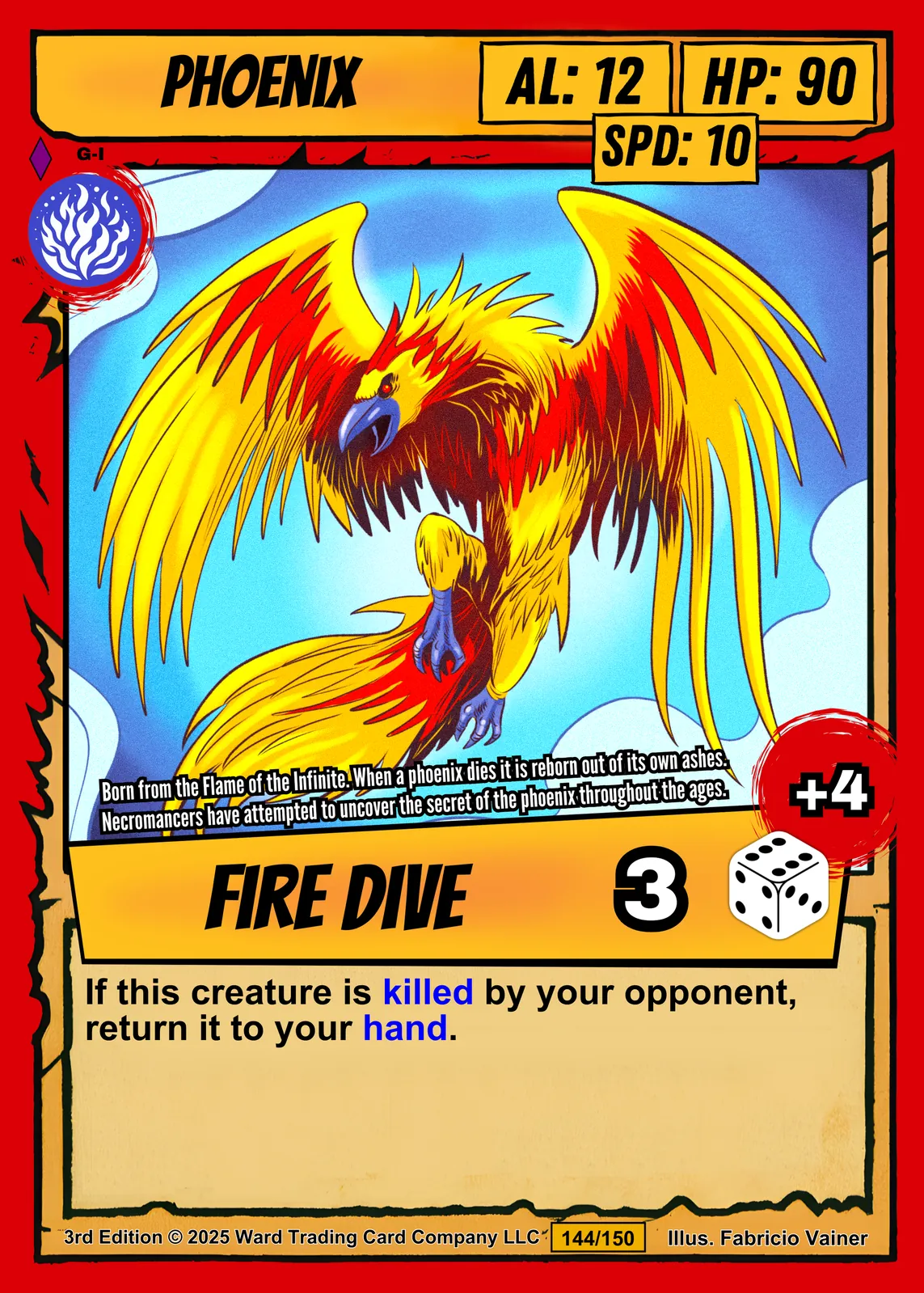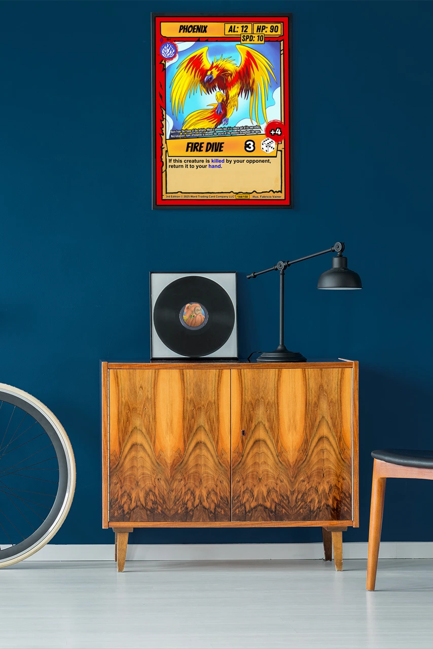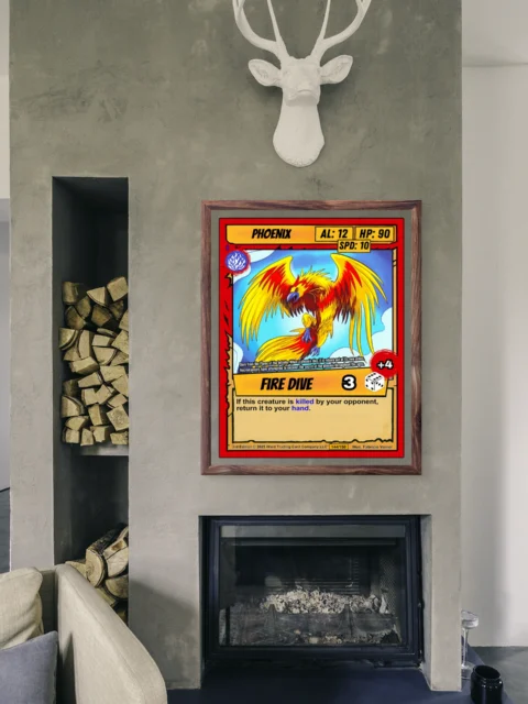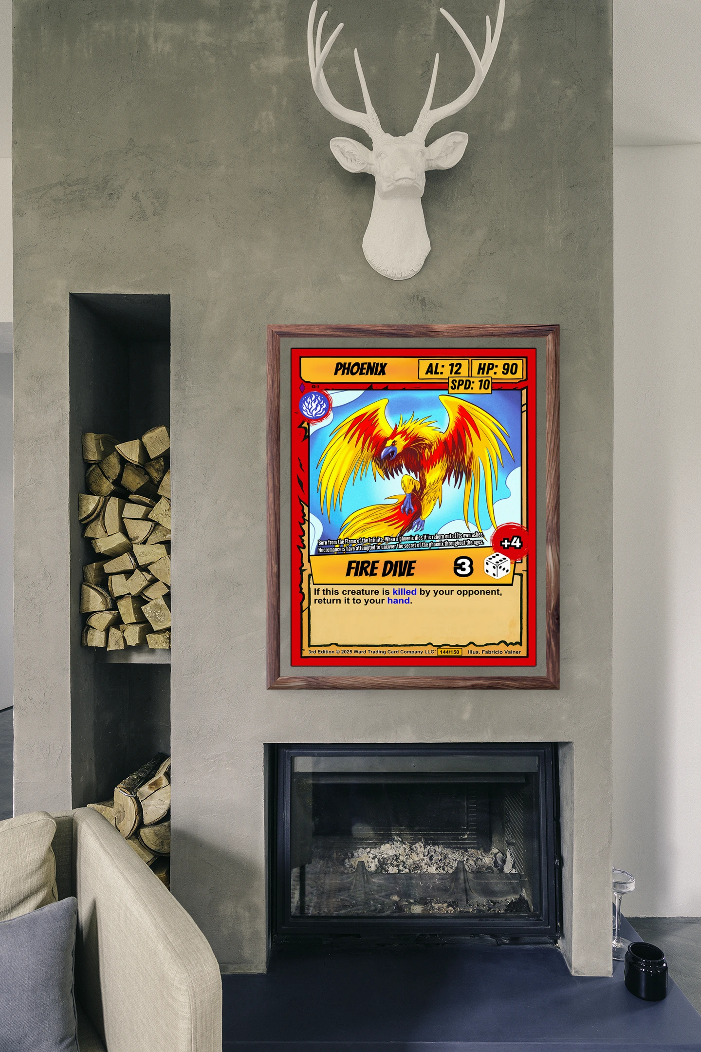 Phoenix encounters demand presence that matches their legendary status in campaigns. Ward TCG collectors recognize cards that capture mythical power through authentic artwork. Particularly, this phoenix trading card canvas print brings that Fire Dive energy home.