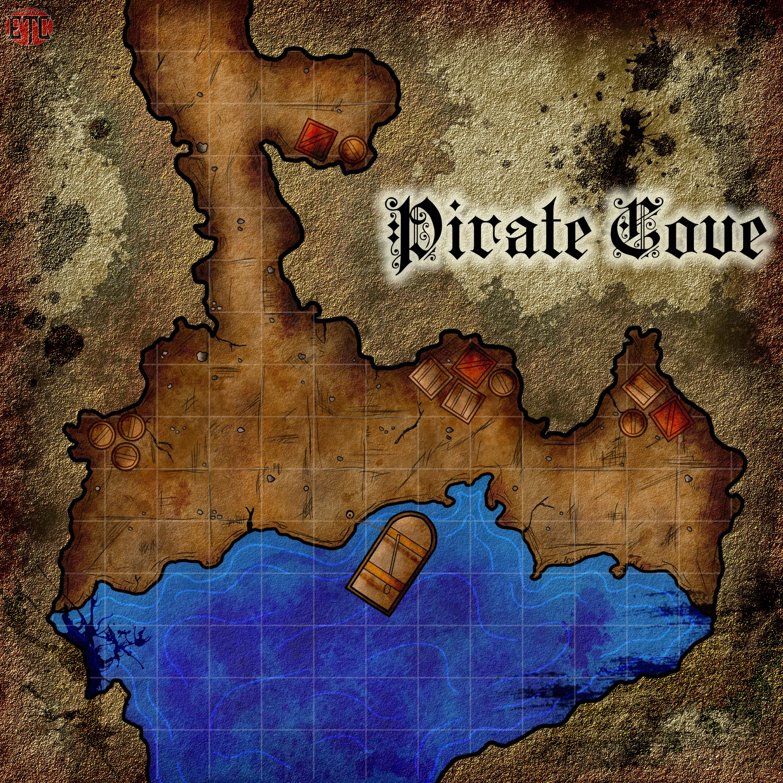 A weathered beach meets deep blue harbor water across a gridded battle map. This pirate cove fantasy battle map canvas print shows wooden structures scattered across sand and shoreline. The gothic blackletter title anchors the composition, notably balancing terrain and open water.