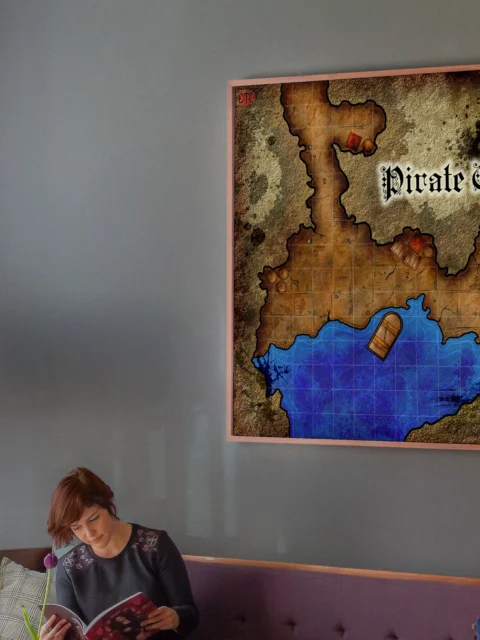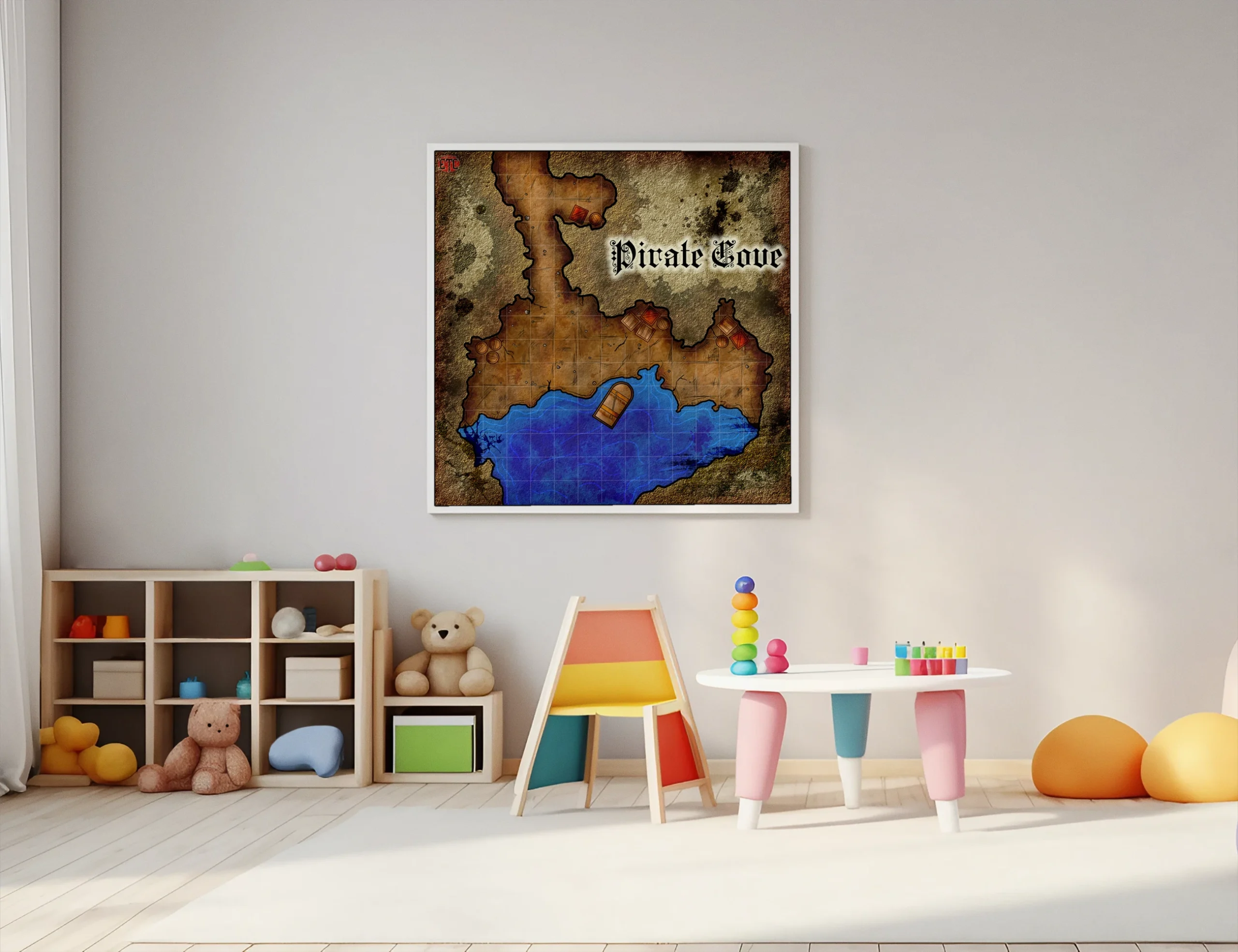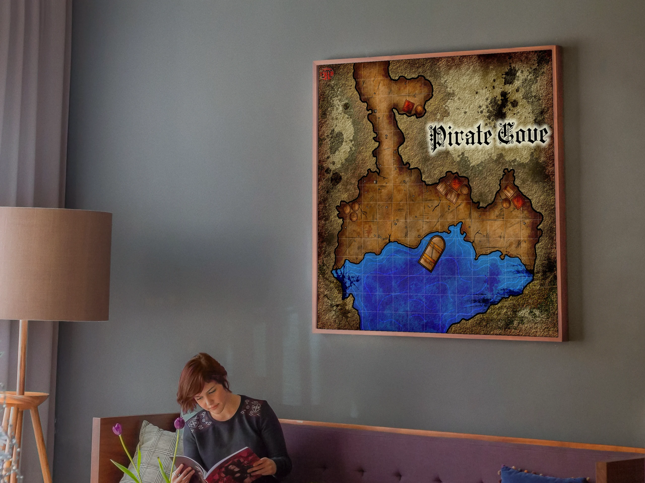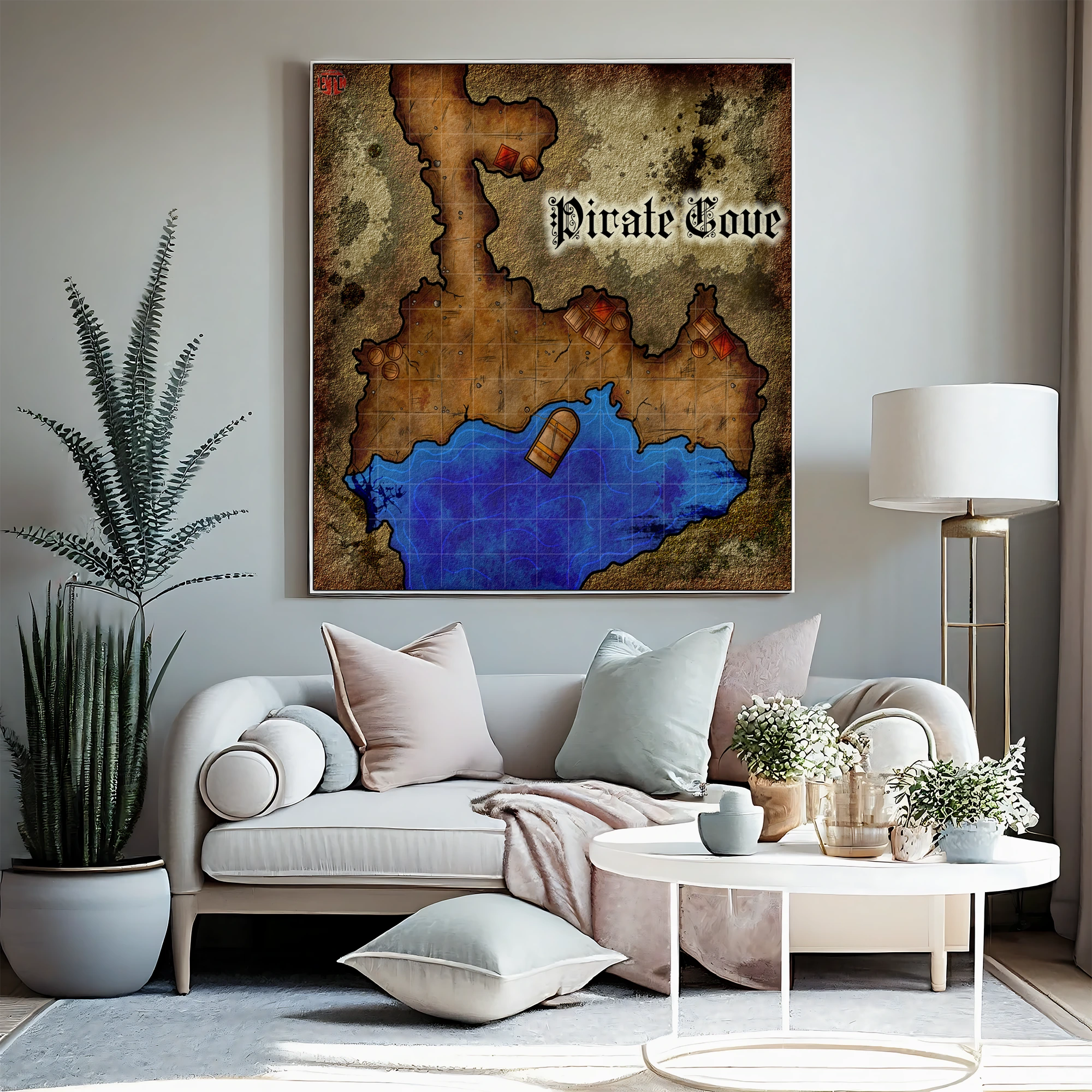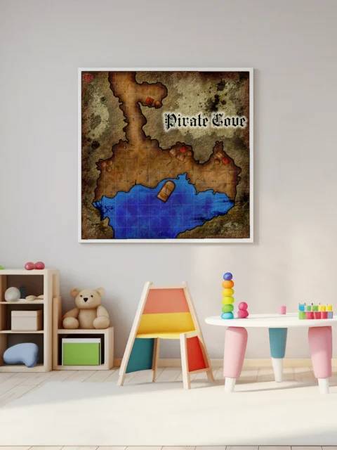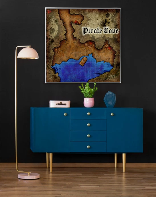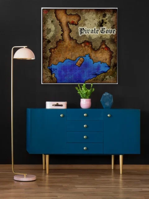 Dungeon masters planning coastal ambushes reference this map during session prep and between encounters. The visible grid and clear terrain boundaries serve players running heist adventures or naval campaigns. This pirate cove fantasy battle map canvas print particularly suits DMs who rotate coastal encounters into ongoing campaigns.