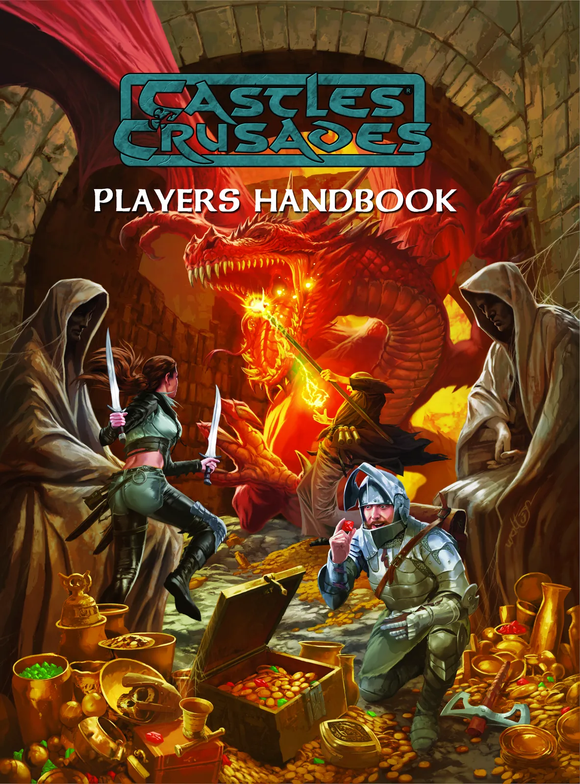 Notably, this artwork includes the official Castles & Crusades logo and Players Handbook title. Therefore, it is presented as an authentic cover art canvas print rather than a text-free illustration. As a result, collectors receive a faithful display of iconic roleplaying imagery. Finally, the alternate cover composition offers a bold, celebratory take on classic fantasy heroics.