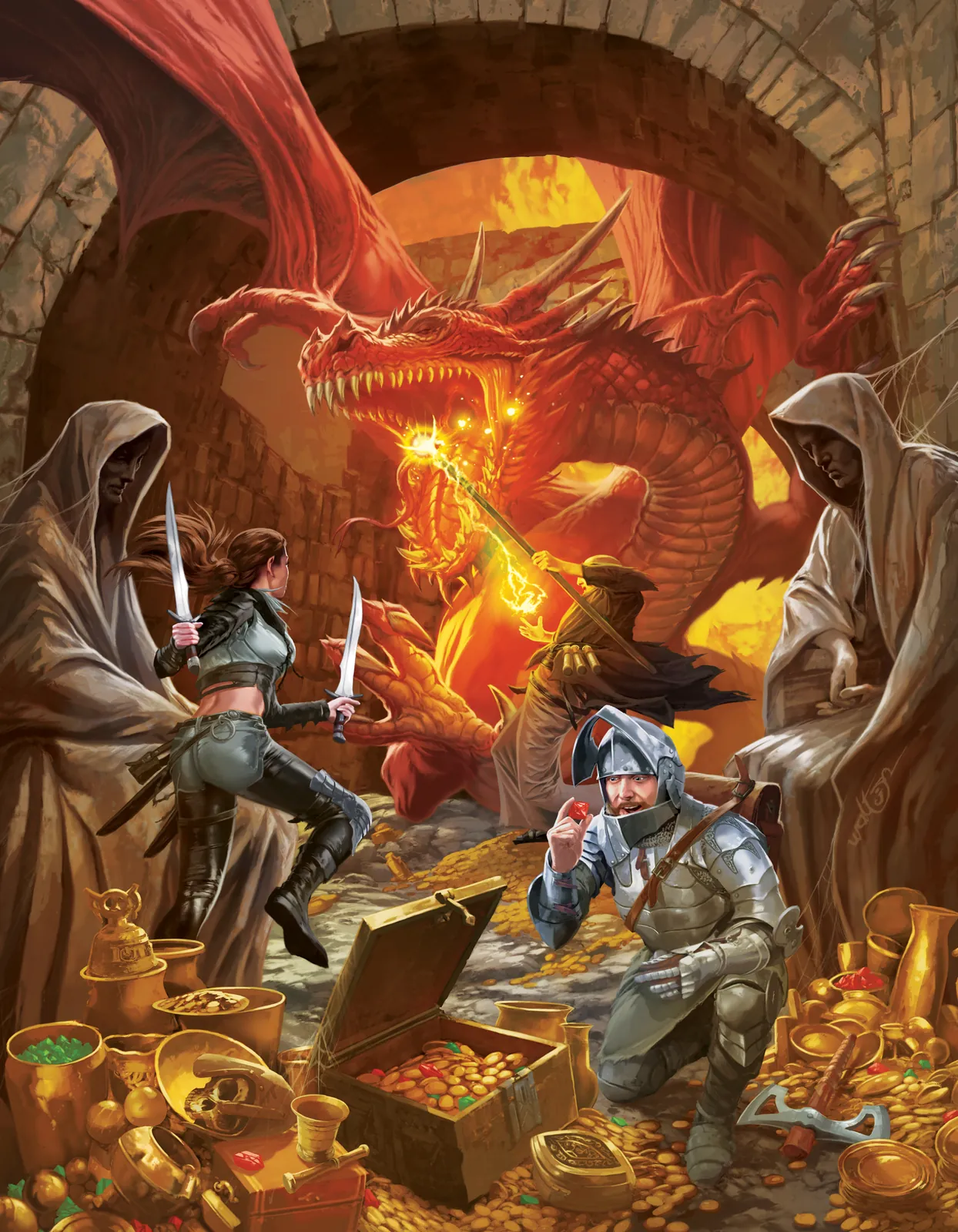 Moreover, a towering red dragon surges forward through an ancient archway, flames and magic colliding at its jaws. Meanwhile, a small band of adventurers presses the attack among scattered treasure. Consequently, movement and scale dominate the composition. In addition, the warm glow of fire contrasts sharply with steel, leather, and shadow.