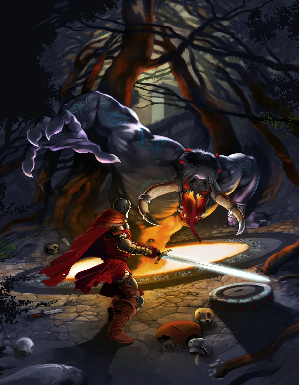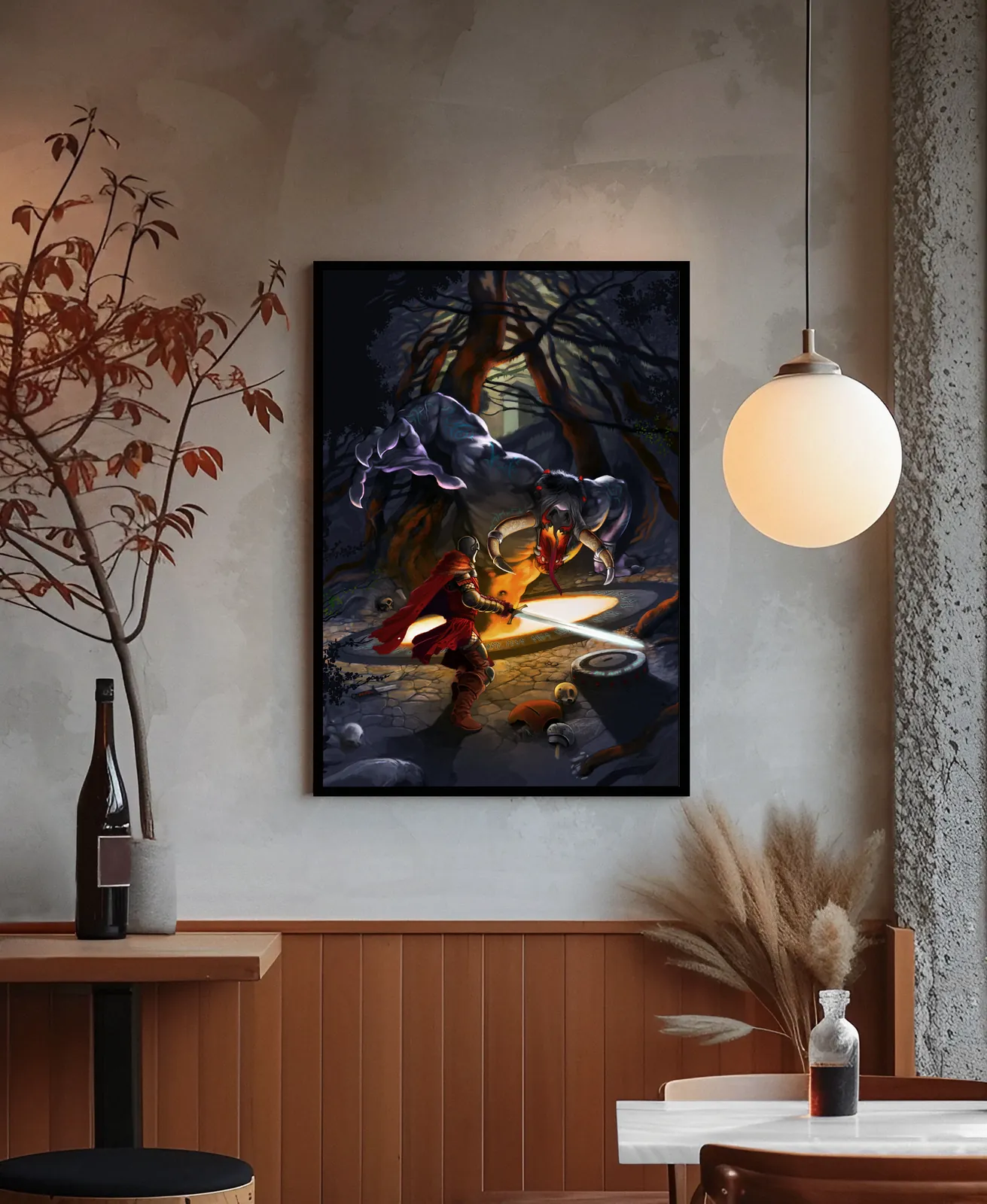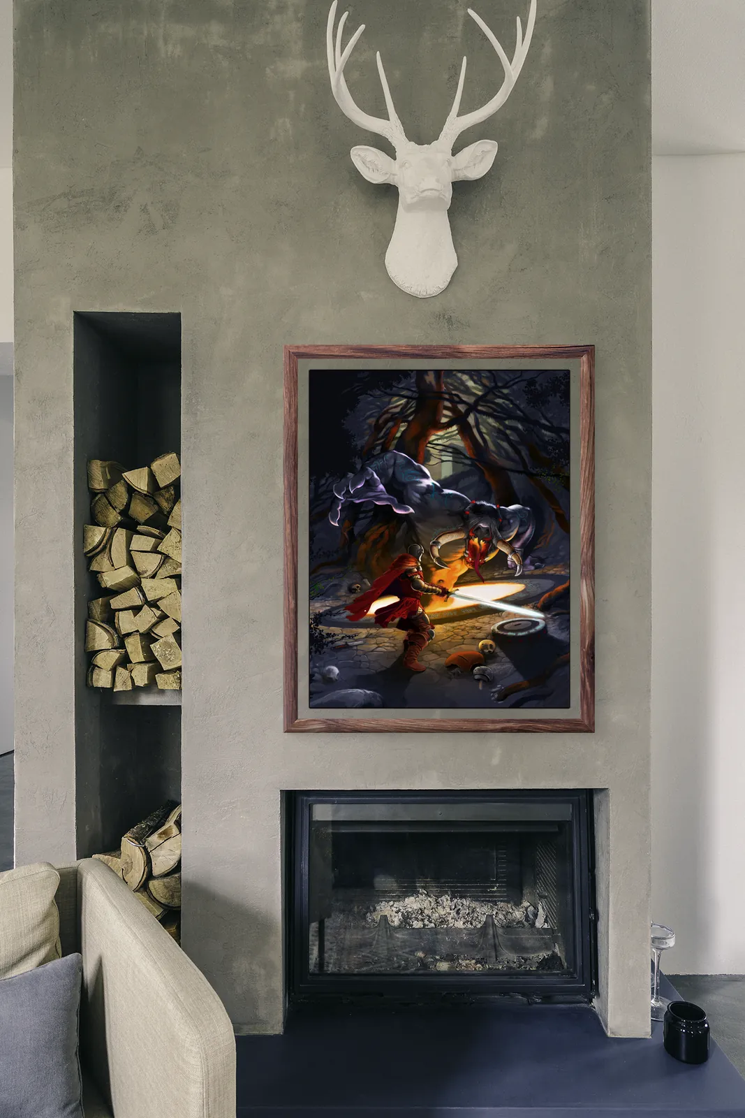 Players Handbook fantasy illustration canvas print shows a lone warrior facing a monstrous foe within a glowing ritual circle, created for immersive fantasy display.