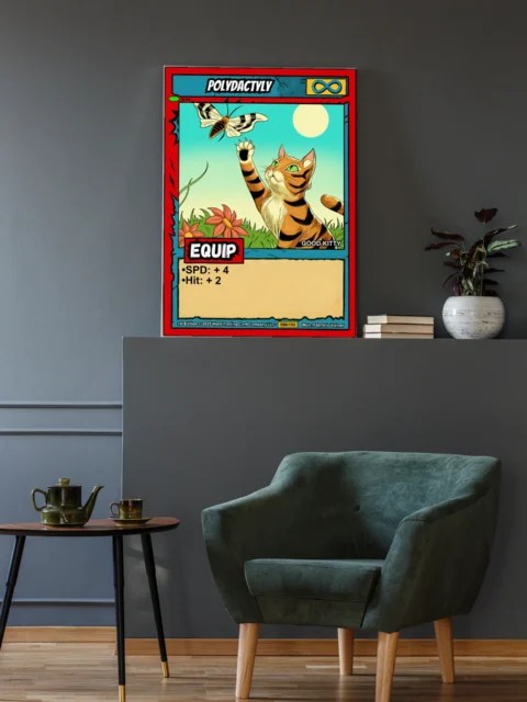 At room scale, the cel-shaded illustration reads as clean comic book linework. Collectors of Ward TCG equipment cards recognize the 090/150 numbering and Fabricio Vainer’s signature style. This polydactyly trading card canvas print brings the whimsical feline artwork into three-dimensional space.