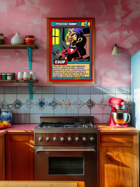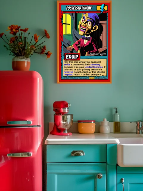 This piece reads clearly from across the room with its high-contrast palette. Ward TCG collectors recognize the retro horror comic styling immediately. The possessed dummy trading card canvas print fits naturally into card art collections or campy horror displays.