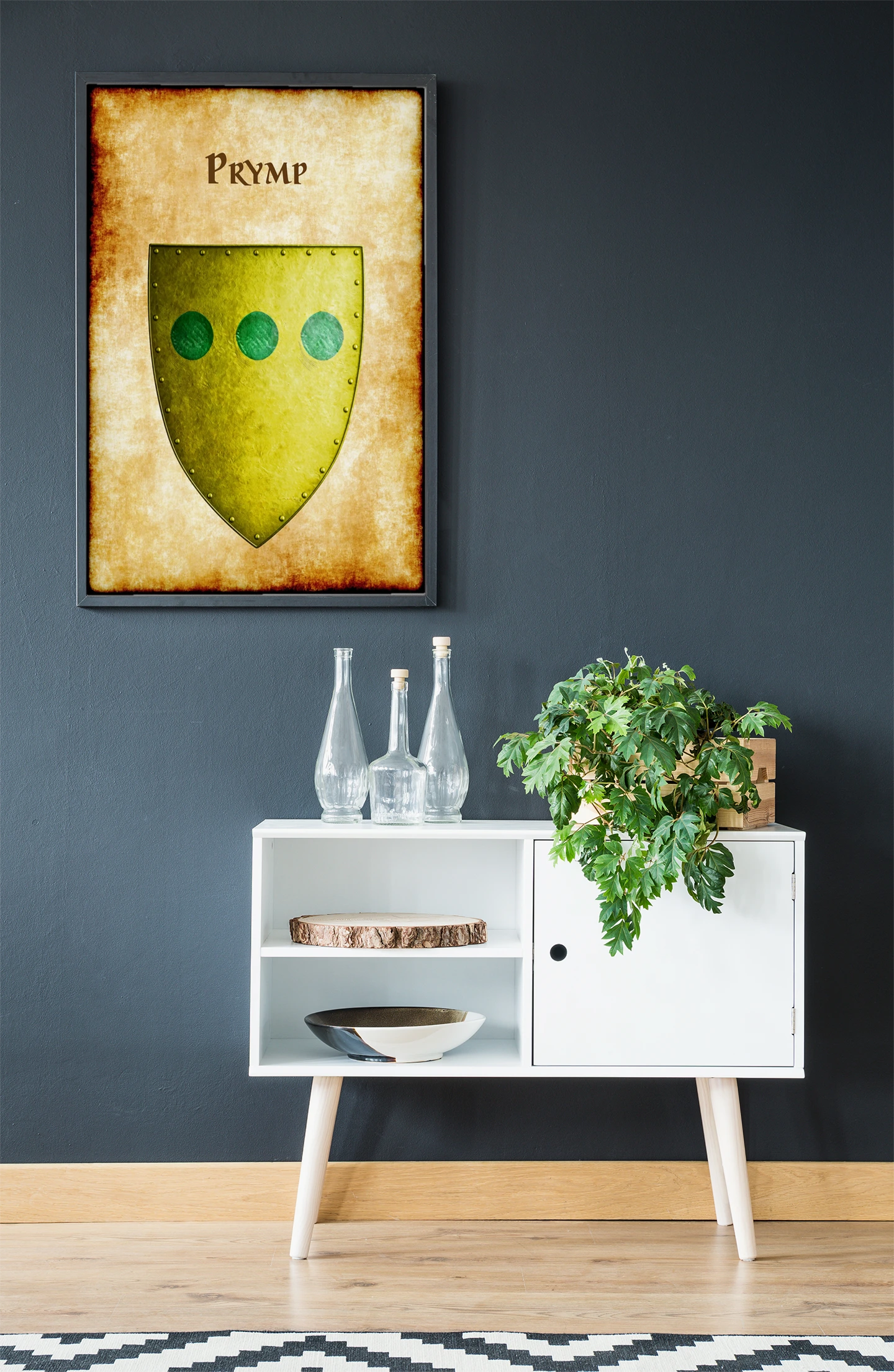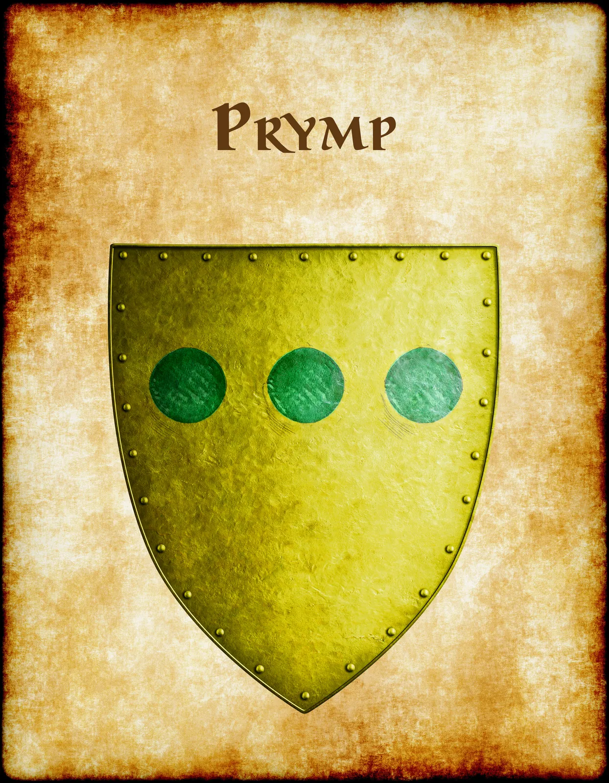 Three green orbs dominate a yellow-green metallic shield. This prymp Greyhawk heraldry canvas print captures medieval faction symbolism. Notably, dark rivets border the weathered heraldic device.