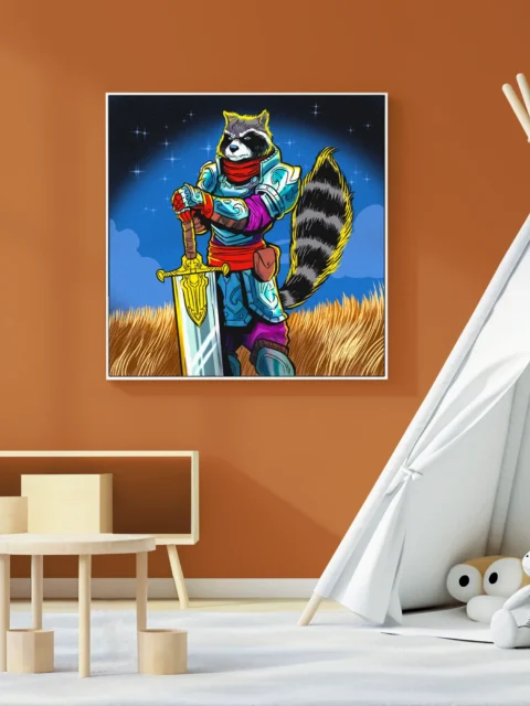 On the wall, the vibrant saturation and bold outlines command presence at display scale. Ward TCG collectors and fantasy creature art enthusiasts gain a gallery-ready piece without card borders. This raccon knight art trading card art canvas print delivers Vainer’s whimsical heroism frame-free.