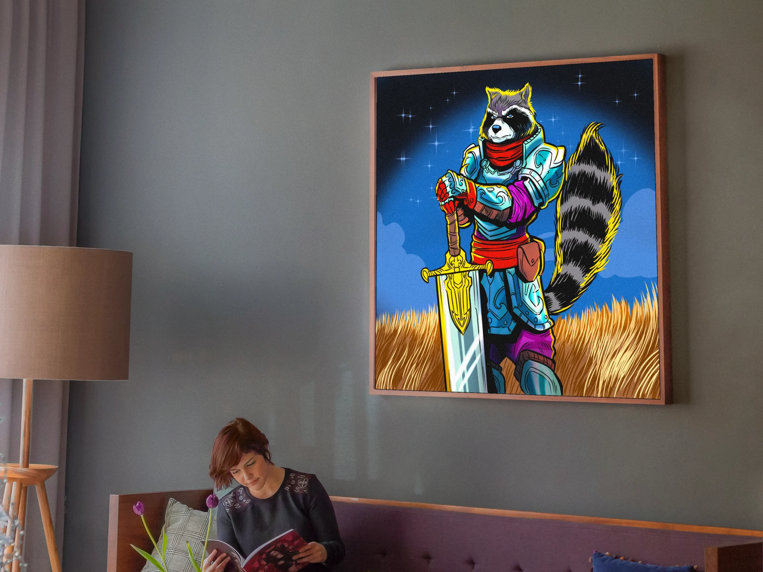 An anthropomorphic raccoon warrior grips a golden sword in a wheat field. This raccon knight art trading card art canvas print captures Fabricio Vainer’s cel-shaded illustration in full detail. Notably, the striped tail extends prominently with yellow-gold highlights throughout.