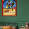Raccoon Canvas Wall Art from Ward TCG: Trading card design with a forward-facing raccoon in falling snow, framed by red borders and yellow stat boxes.