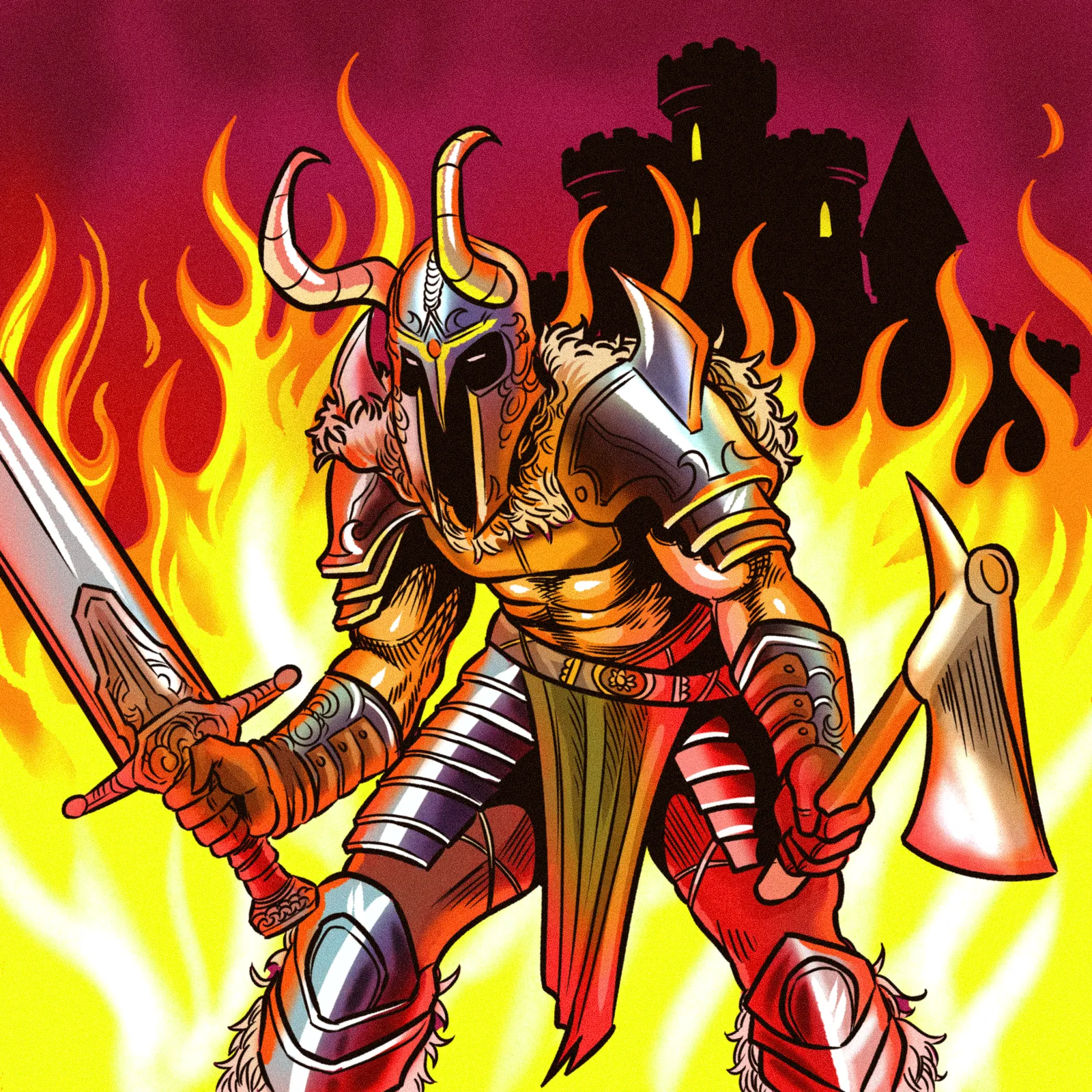 Additionally, the color palette contrasts magenta sky against orange fire and silver armor plating. Bold black outlines define every muscle, weapon edge, and armor segment with comic-book precision. The composition also places a silhouetted castle behind the inferno for narrative depth.
