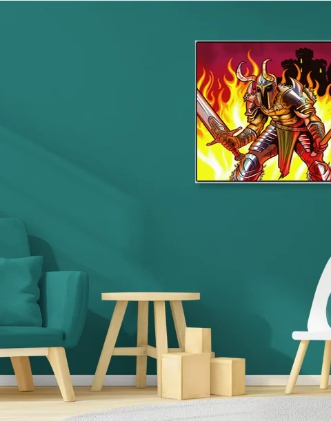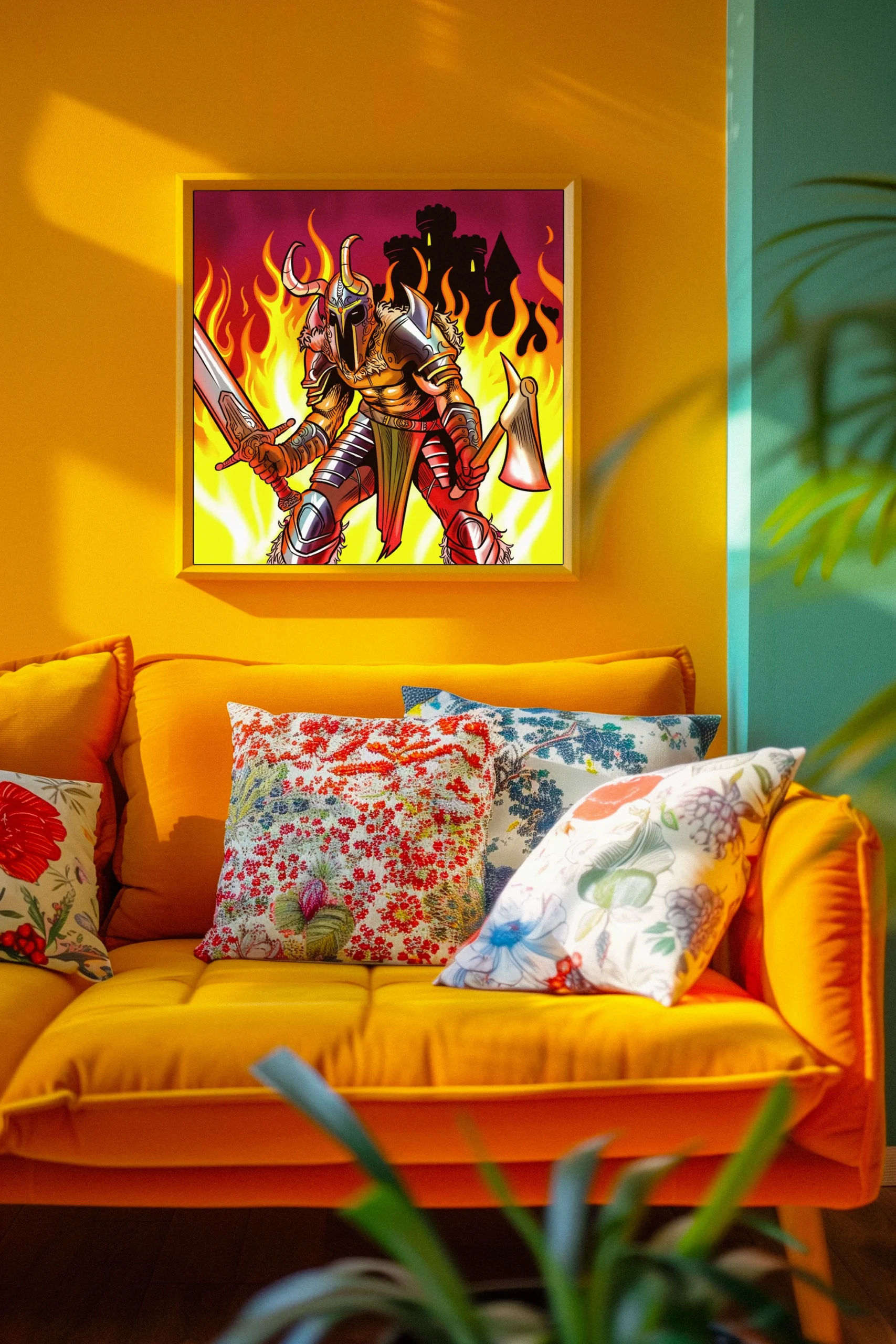 Display this in game rooms where retro fantasy art and aggressive warrior imagery match the space. Additionally, it pairs well with other high-saturation illustrated pieces from the same era style.