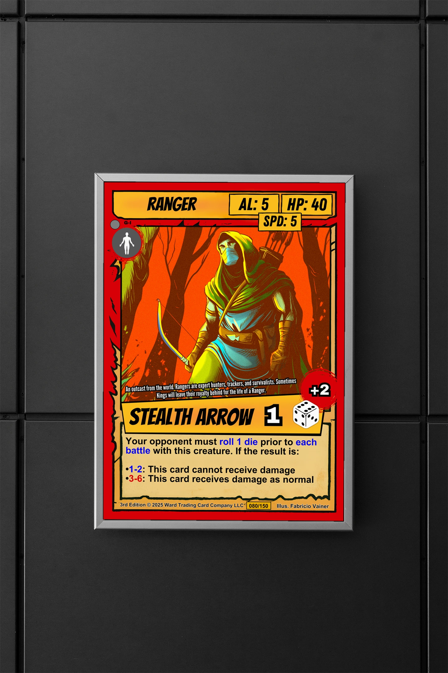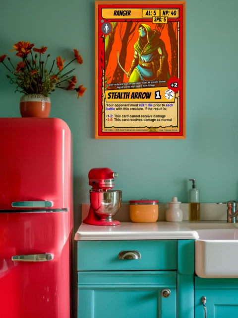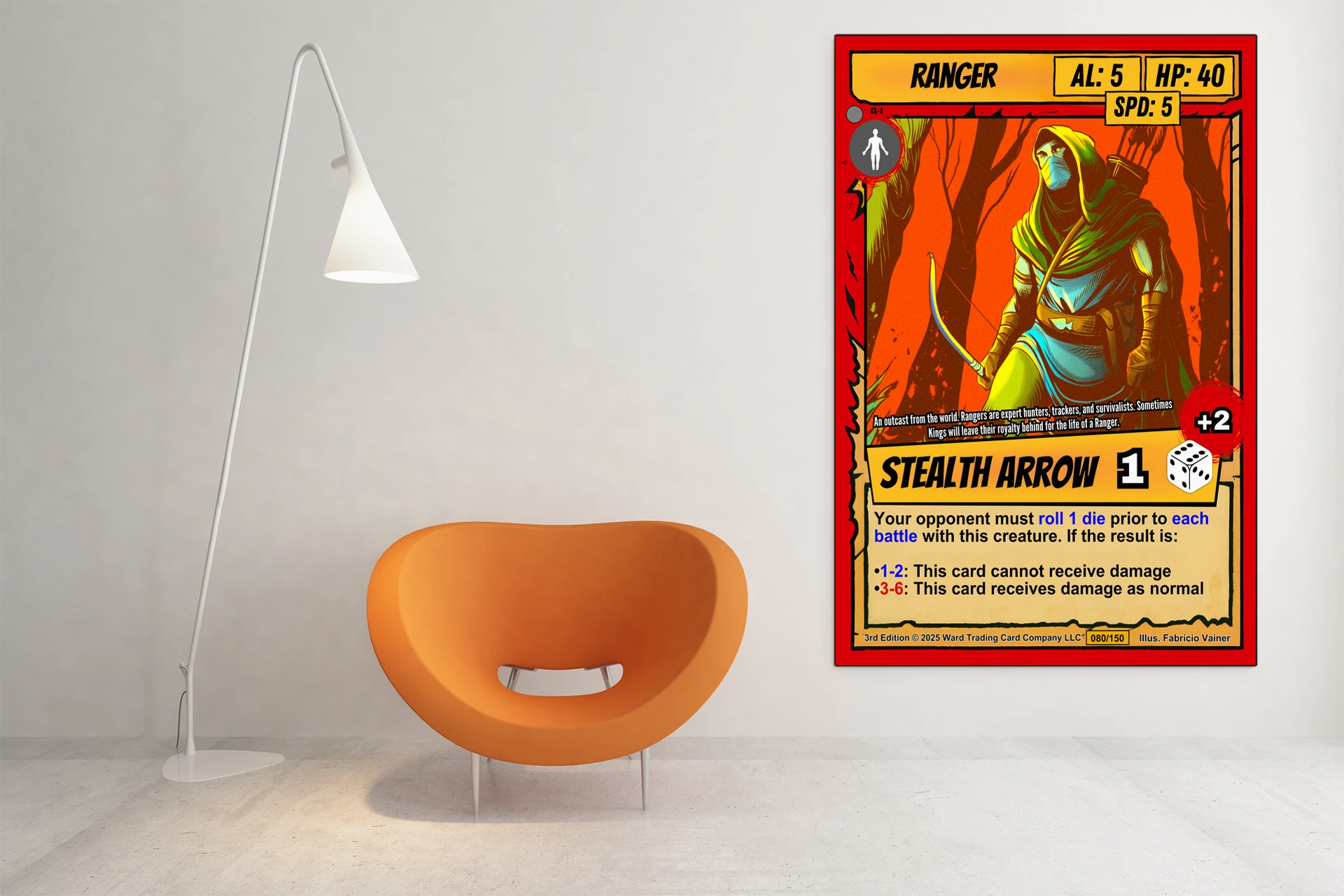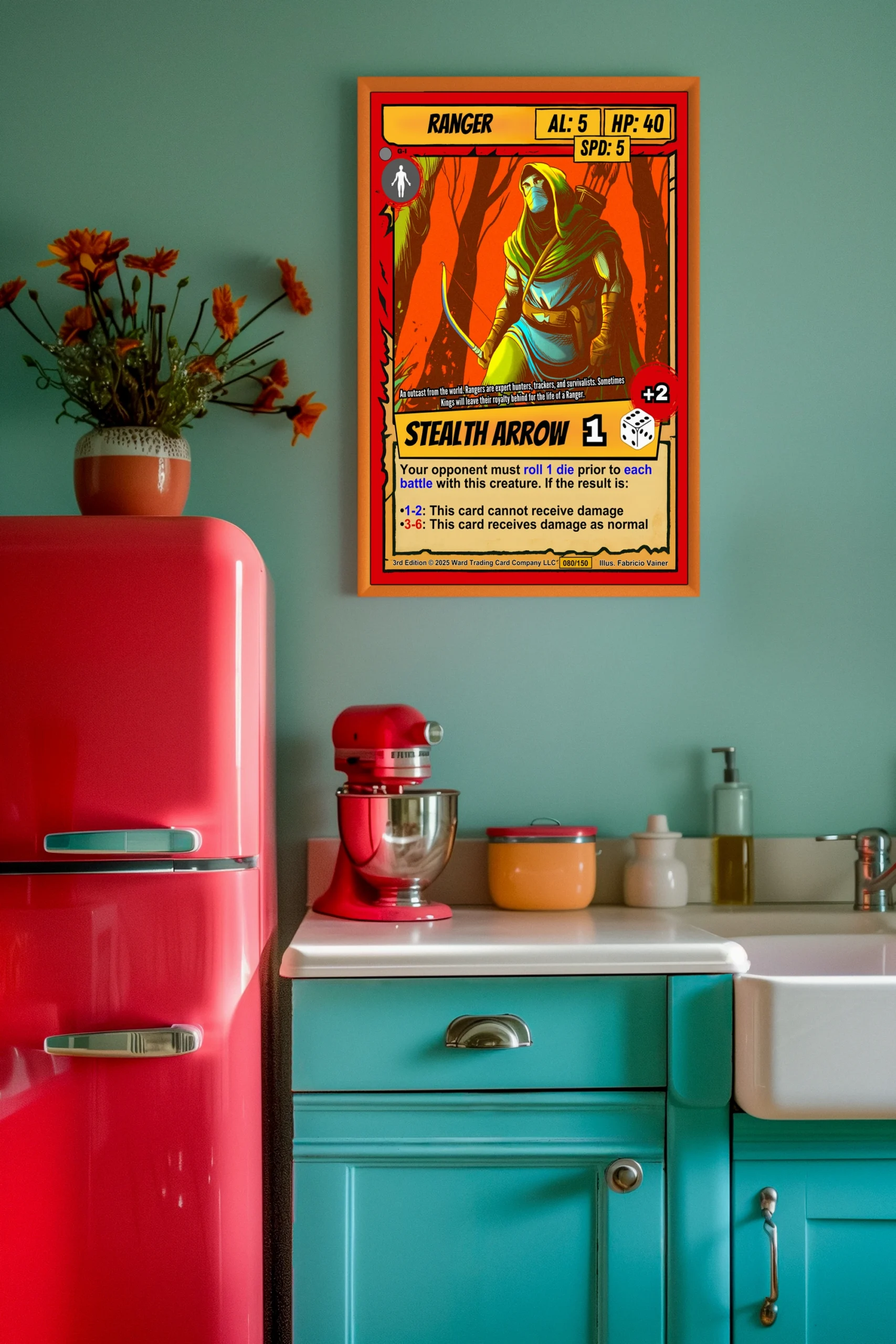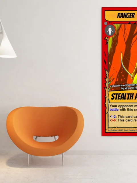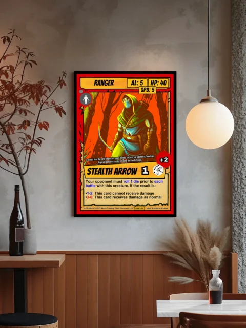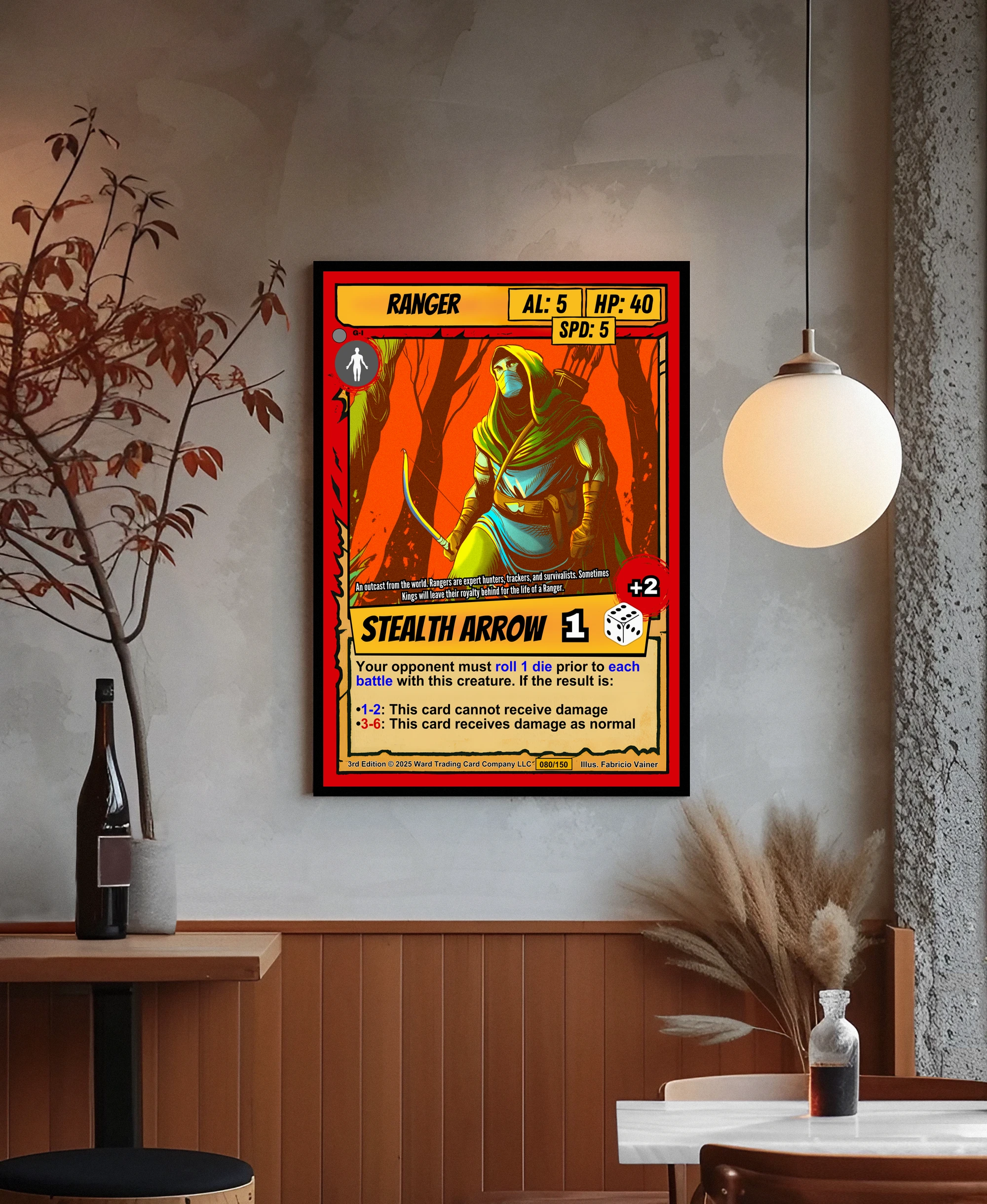 Owning this marks you as someone who values classic TCG artistry over mass market trends. Collectors recognize Vainer’s distinctive 1990s comic style and Ward’s BoardGameGeek credibility. Particularly, this ranger trading card canvas print speaks to those who appreciate gaming heritage.