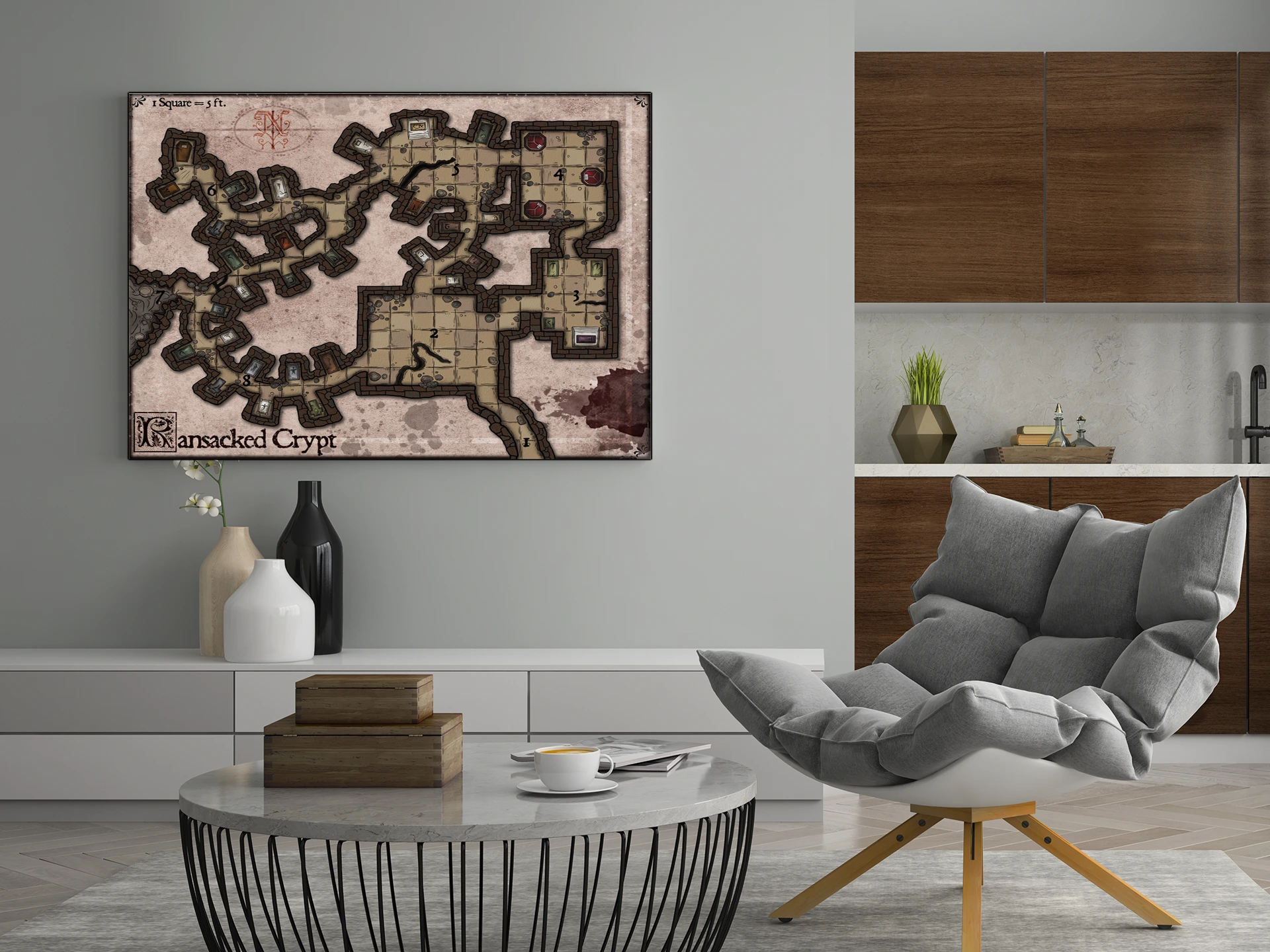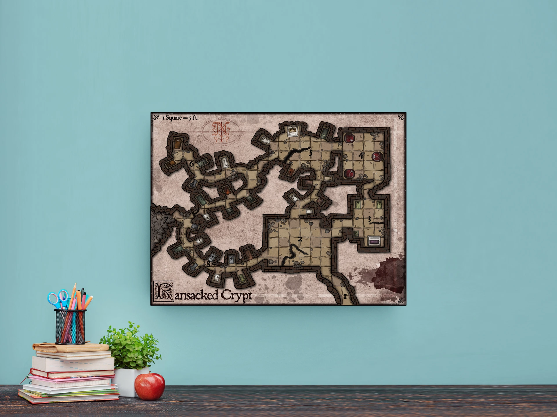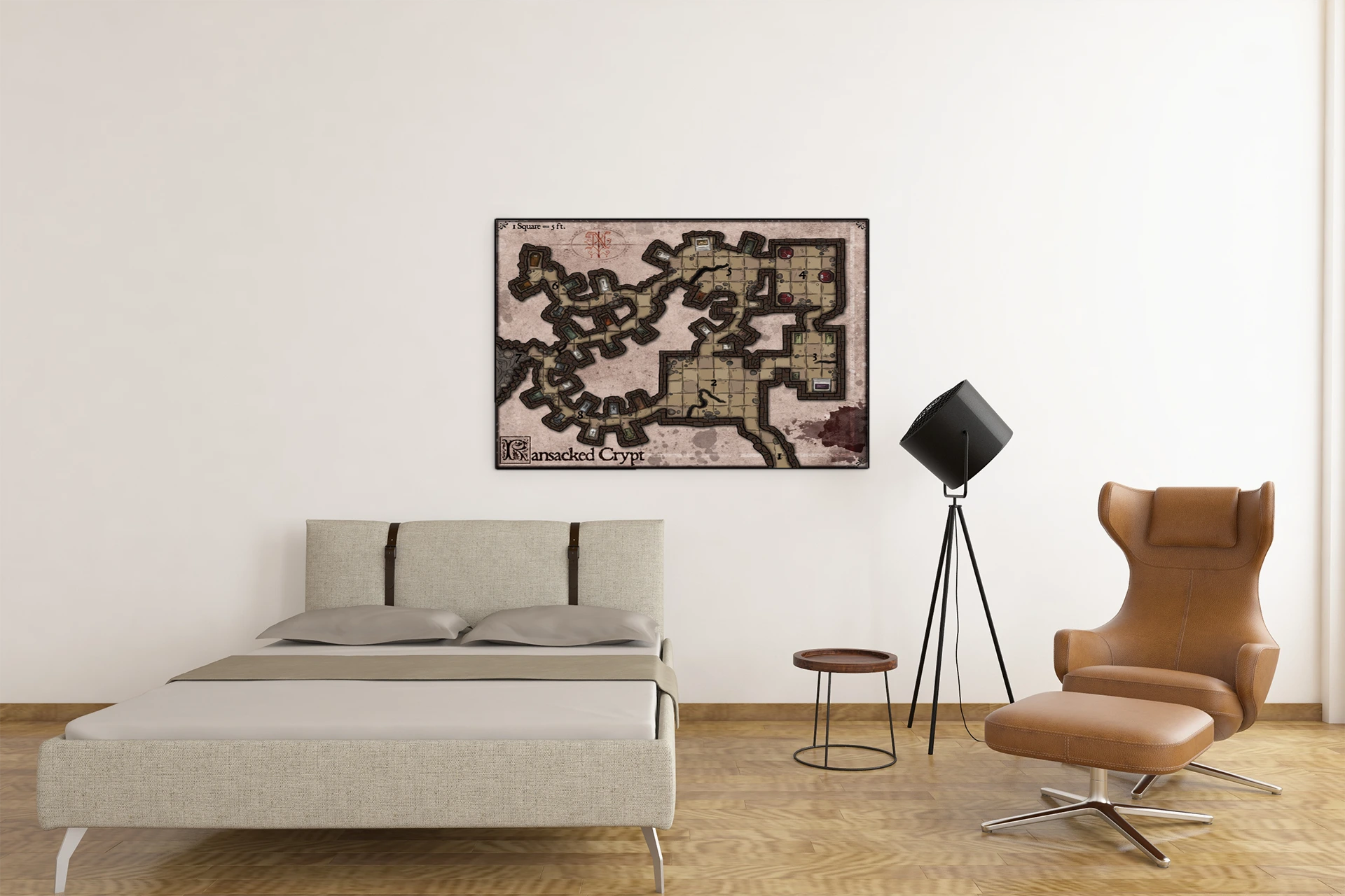 Dungeon masters running undead encounters recognize this layout immediately. The piece speaks to players who prep encounters and value functional art. This ransacked crypt fantasy battle map canvas print particularly suits those who run classic crypt delves.