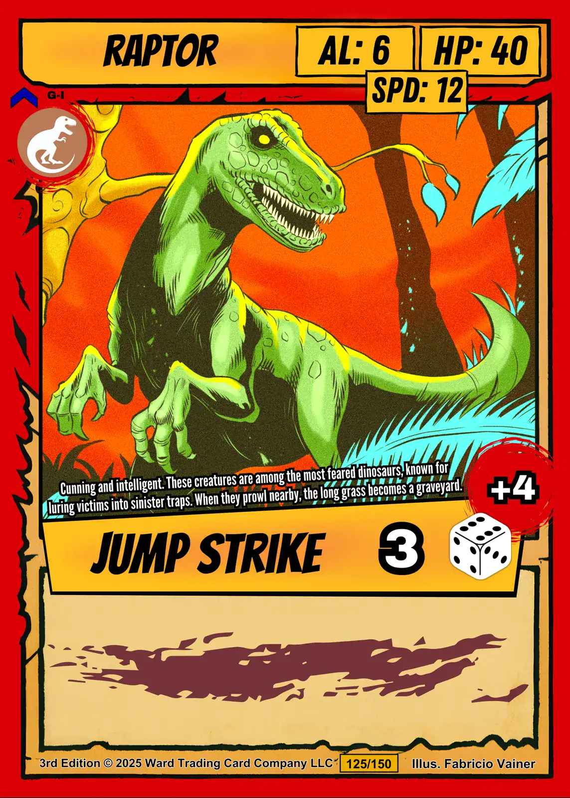 What is more, the yellow header section displays clear stat boxes with AL: 6, HP: 40, and SPD: 12. The red circular dinosaur icon anchors the top left corner. Meanwhile, the bottom yellow section showcases the Jump Strike ability with dice symbols.