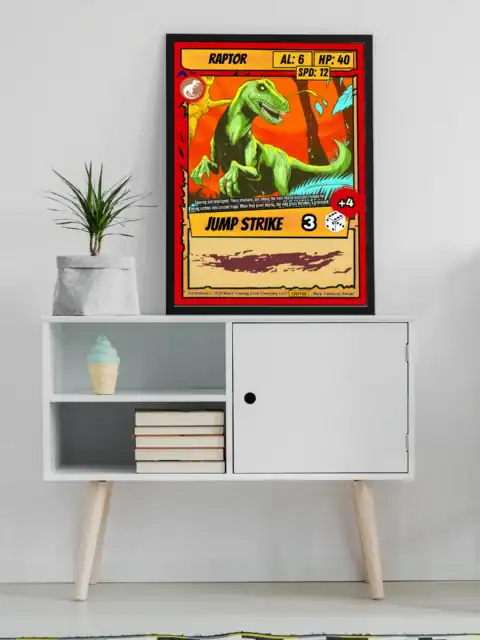 Gaming rooms benefit from this raptor’s intimidating presence framed above a campaign planning area. The bold colors moreover complement dice collections and card storage displays.