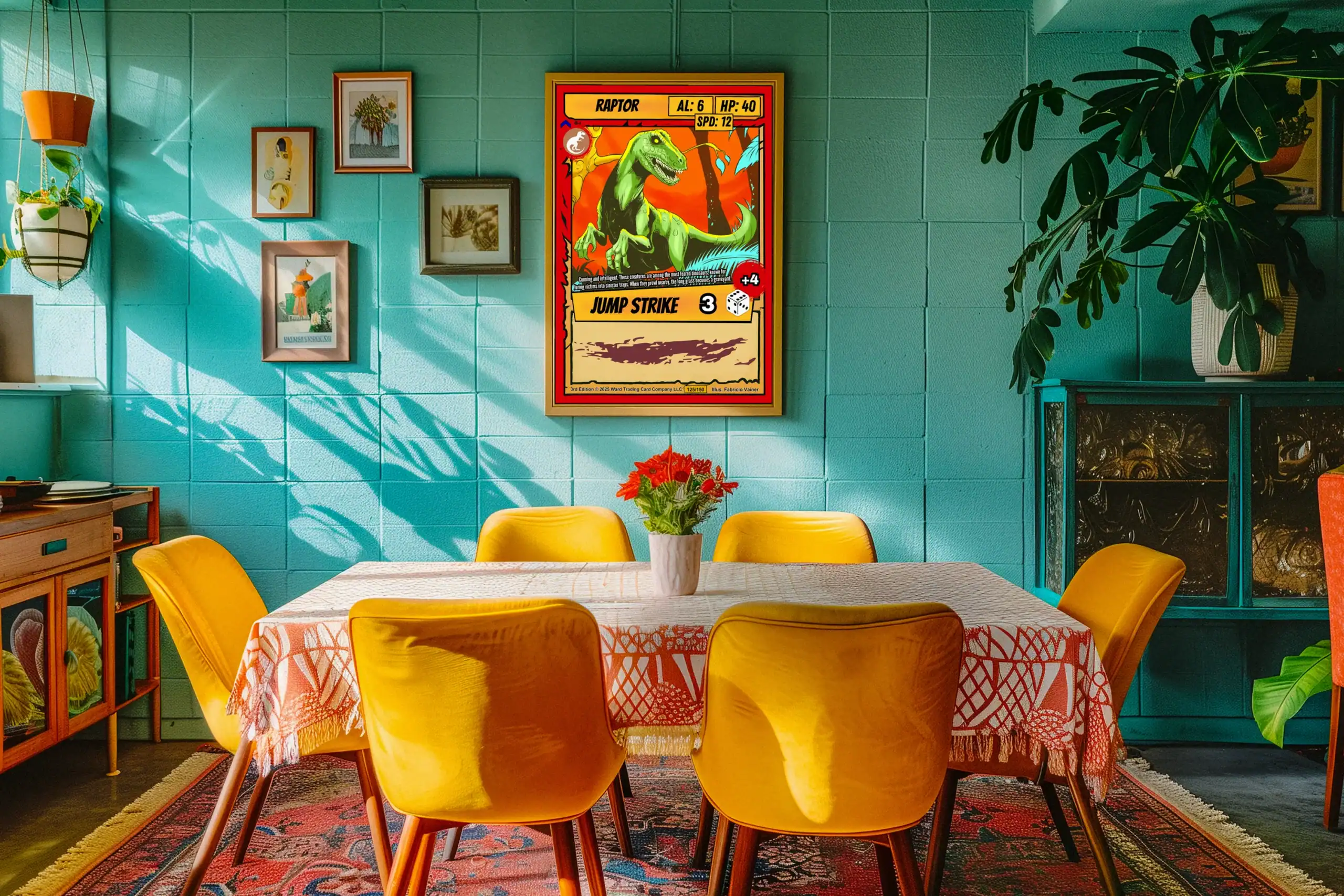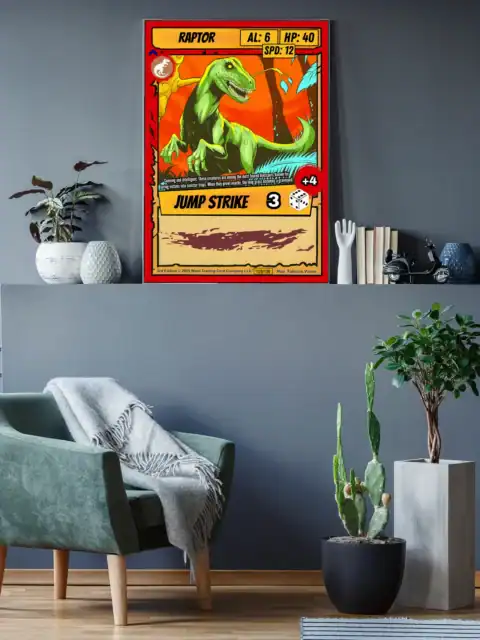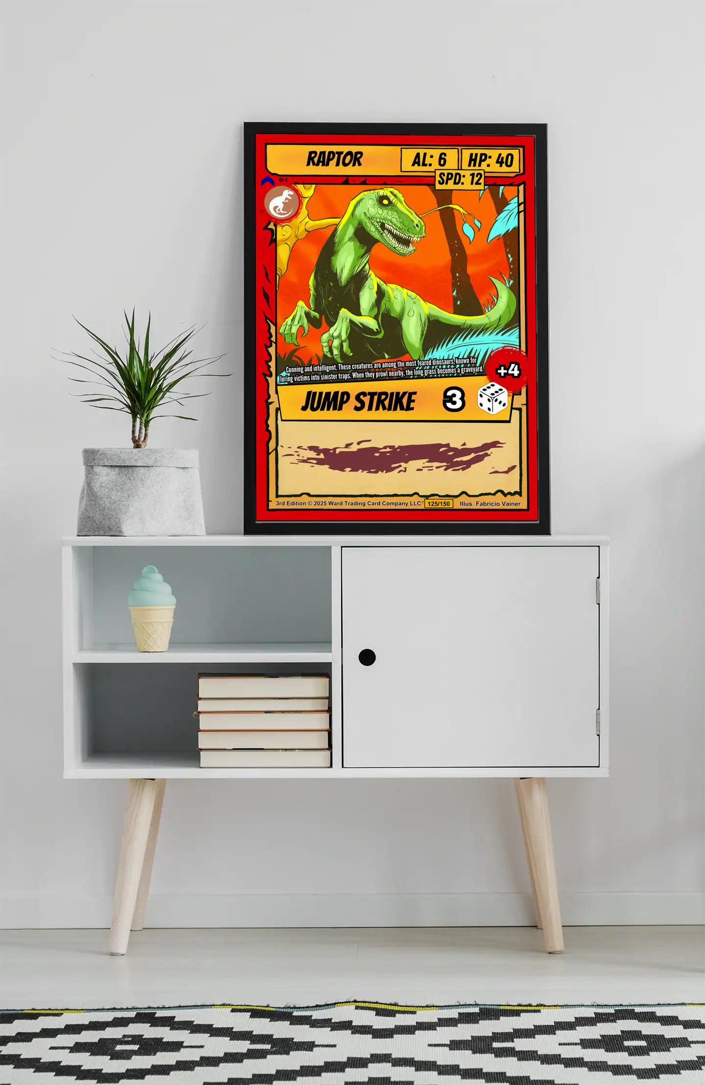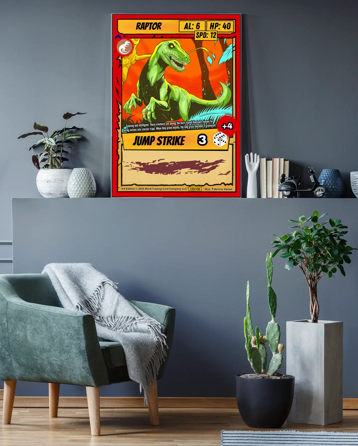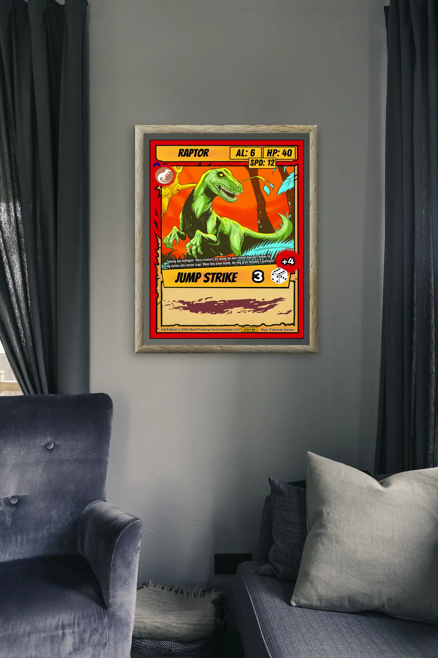 The cel-shaded rendering technique gives this raptor dimensional weight that screens cannot match. TCG collectors recognize Vainer’s signature style from Ward’s growing card roster. This raptor trading card canvas print particularly appeals to fans of 1990s comic aesthetics.
