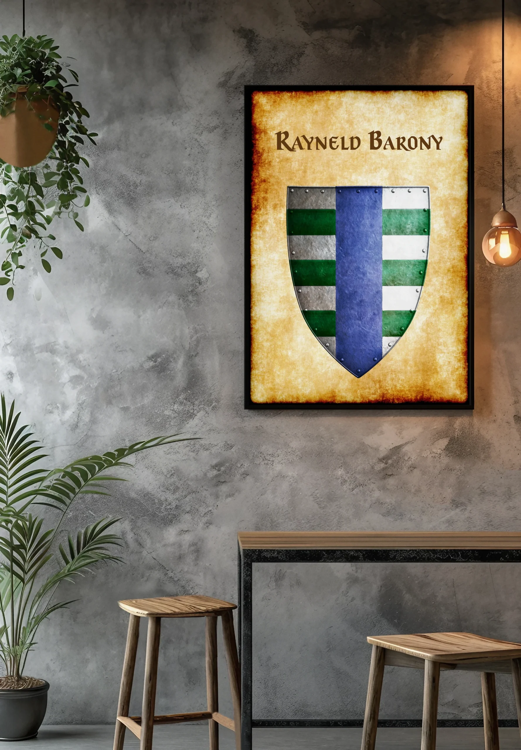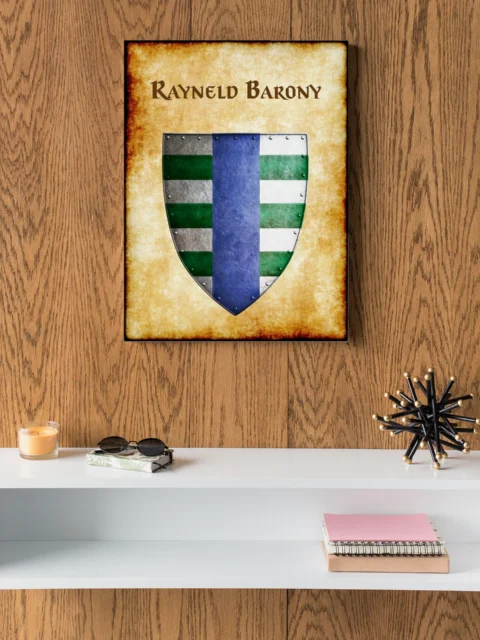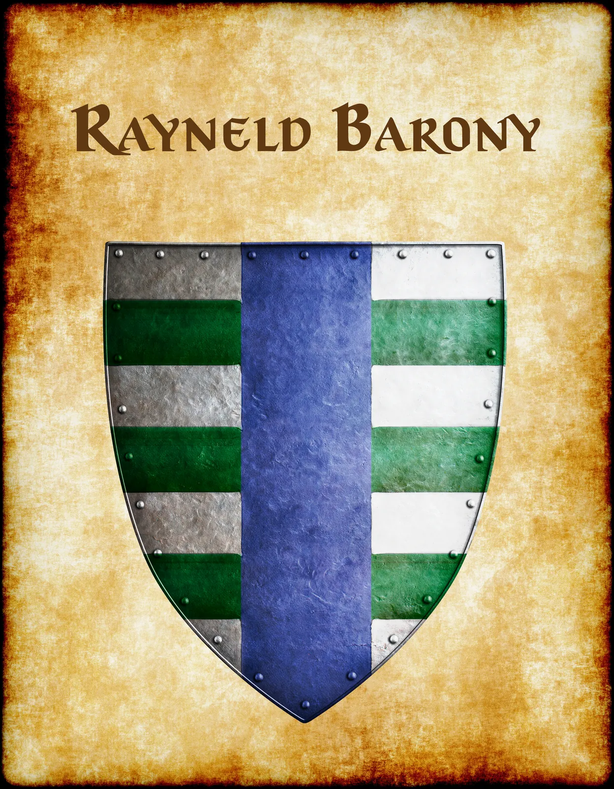 A heater shield divides at center with an azure pale between matching barry fields. This rayneld barony Greyhawk heraldry canvas print displays six alternating bars of argent and vert. Notably, metal rivets border the shield edge in dark grey hammered texture.