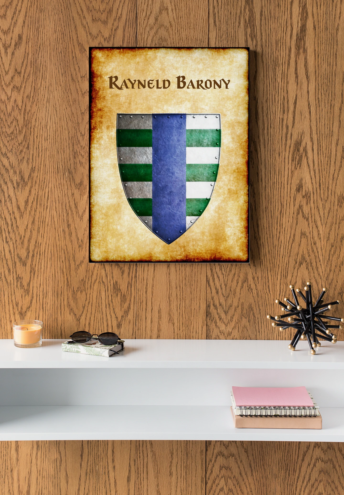 Position this above your worldbuilding library where Greyhawk sourcebooks and Anna Meyer maps already live. Additionally, the aged parchment background anchors a game room alongside other Flanaess heraldic devices.