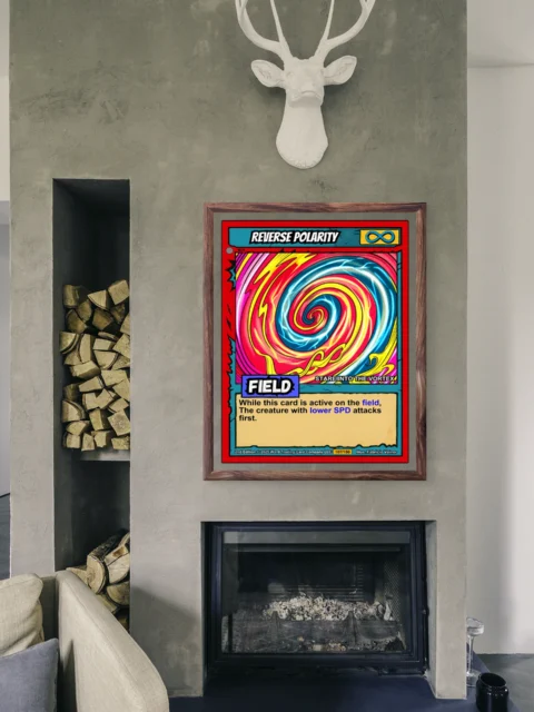 At room scale, the psychedelic vortex commands attention from across the space. Ward TCG collectors seeking field-type card art will recognize the purple type indicator and flavor text. This reverse polarity trading card canvas print brings Fabricio Vainer’s Gen 2 illustration into full gallery format.