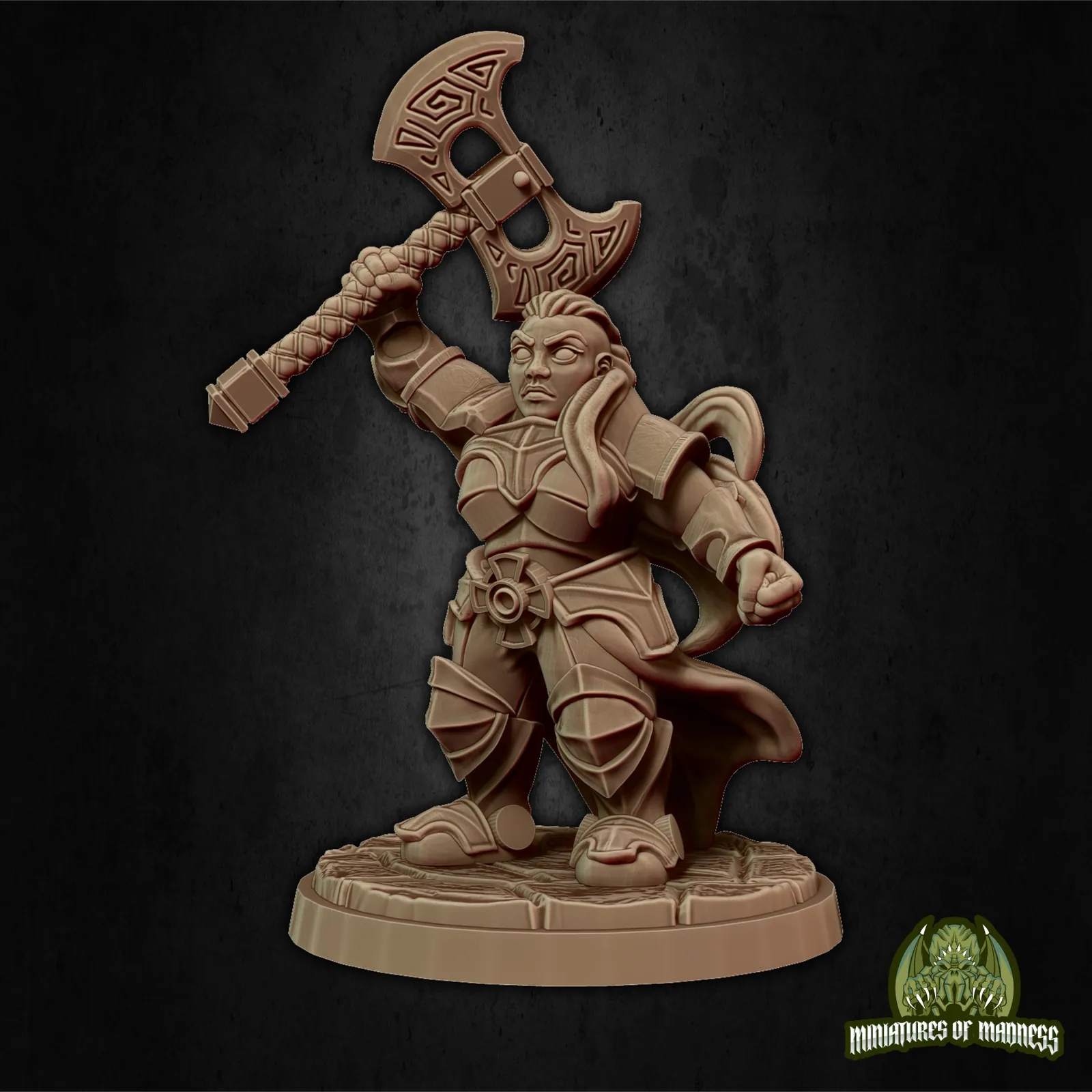 On campaign tables, she leads warbands when diplomacy ends and axes speak. Additionally, her base detail rewards close viewing in display cases alongside other Oakentap defenders.