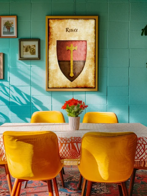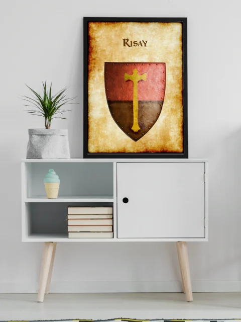 Additionally, the parchment background ages the device with burnt umber edges and mottled cream tones. Risay appears among the lesser-known noble houses catalogued in Anna Meyer’s Flanaess heraldic documentation. Moreover, the cross pattée — a charge associated with crusading orders — suggests martial heritage within Greyhawk’s feudal hierarchies.