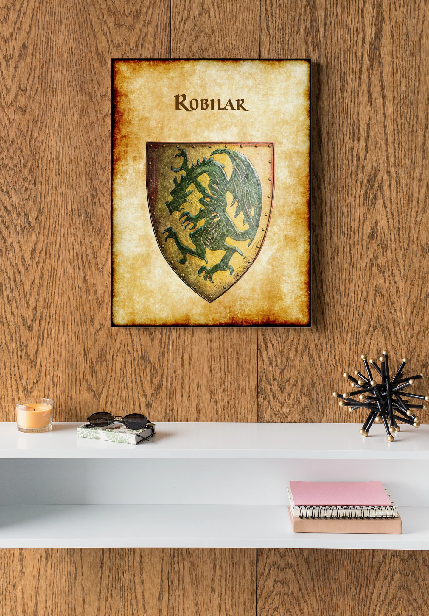 A heater shield bears a multi-headed green dragon rampant on hammered gold. This robilar Greyhawk heraldry canvas print captures the device of Lord Robilar himself. Notably, bronze rivets stud the brown leather border wrapping the shield’s edge.