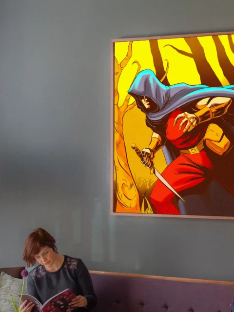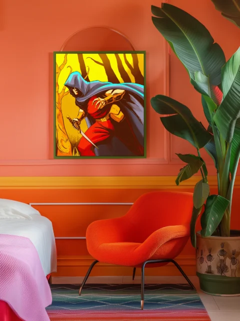 Game rooms gain a dramatic focal point that pairs with other Ward TCG character art. Additionally, creative studios benefit from the bold linework and dynamic composition as visual inspiration.