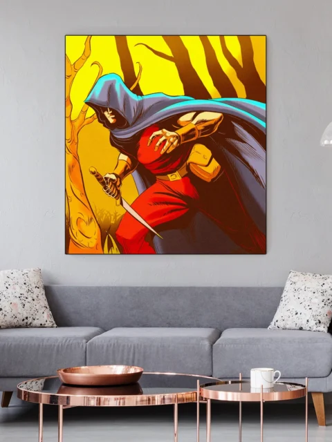 A hooded rogue advances with sword drawn and hand raised defensively. This rogue art trading card art canvas print captures Fabricio Vainer’s bold comic illustration style. Notably, the figure’s shadowed face beneath the hood creates immediate mystery.