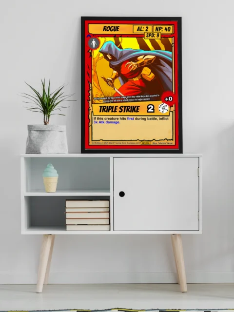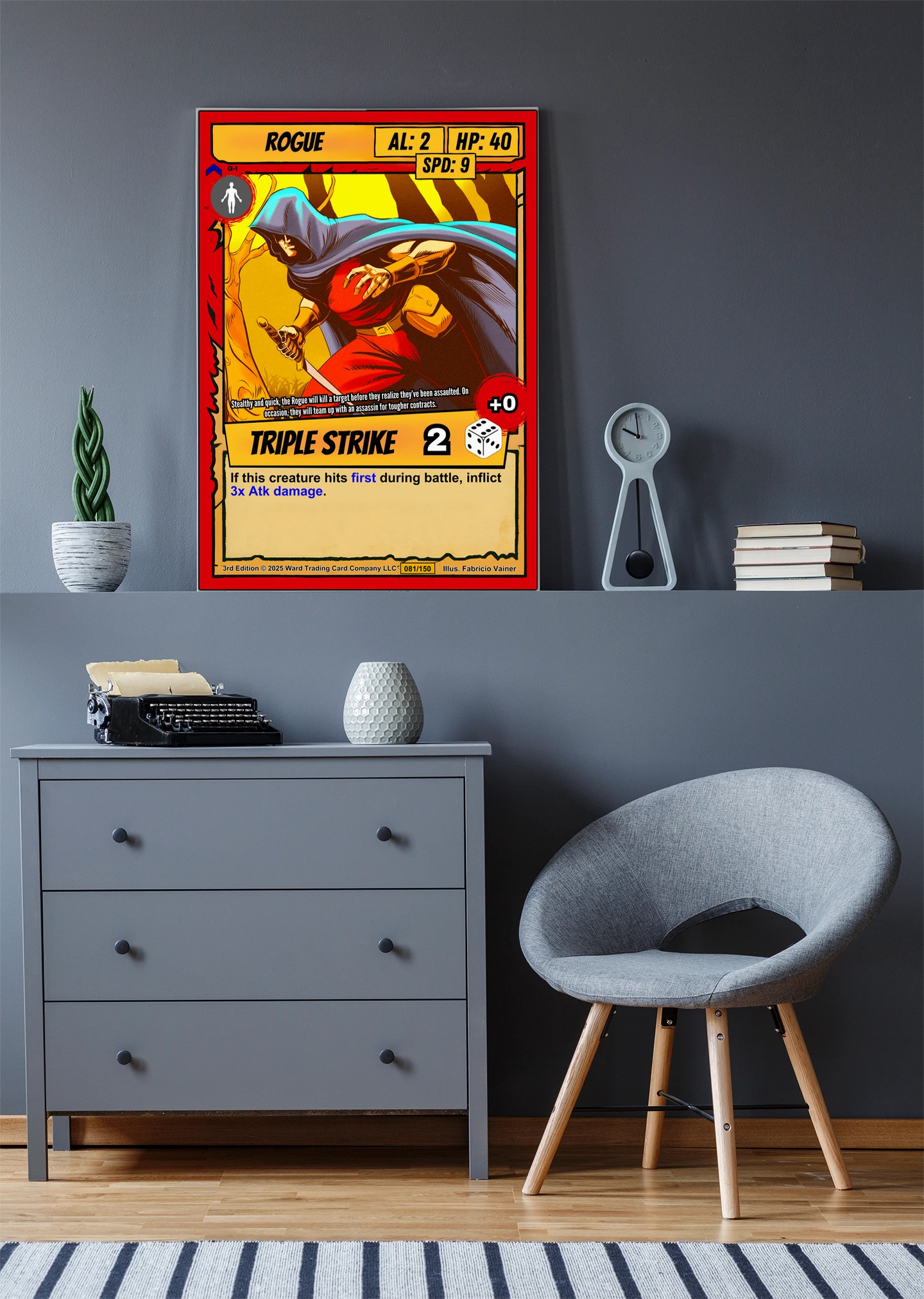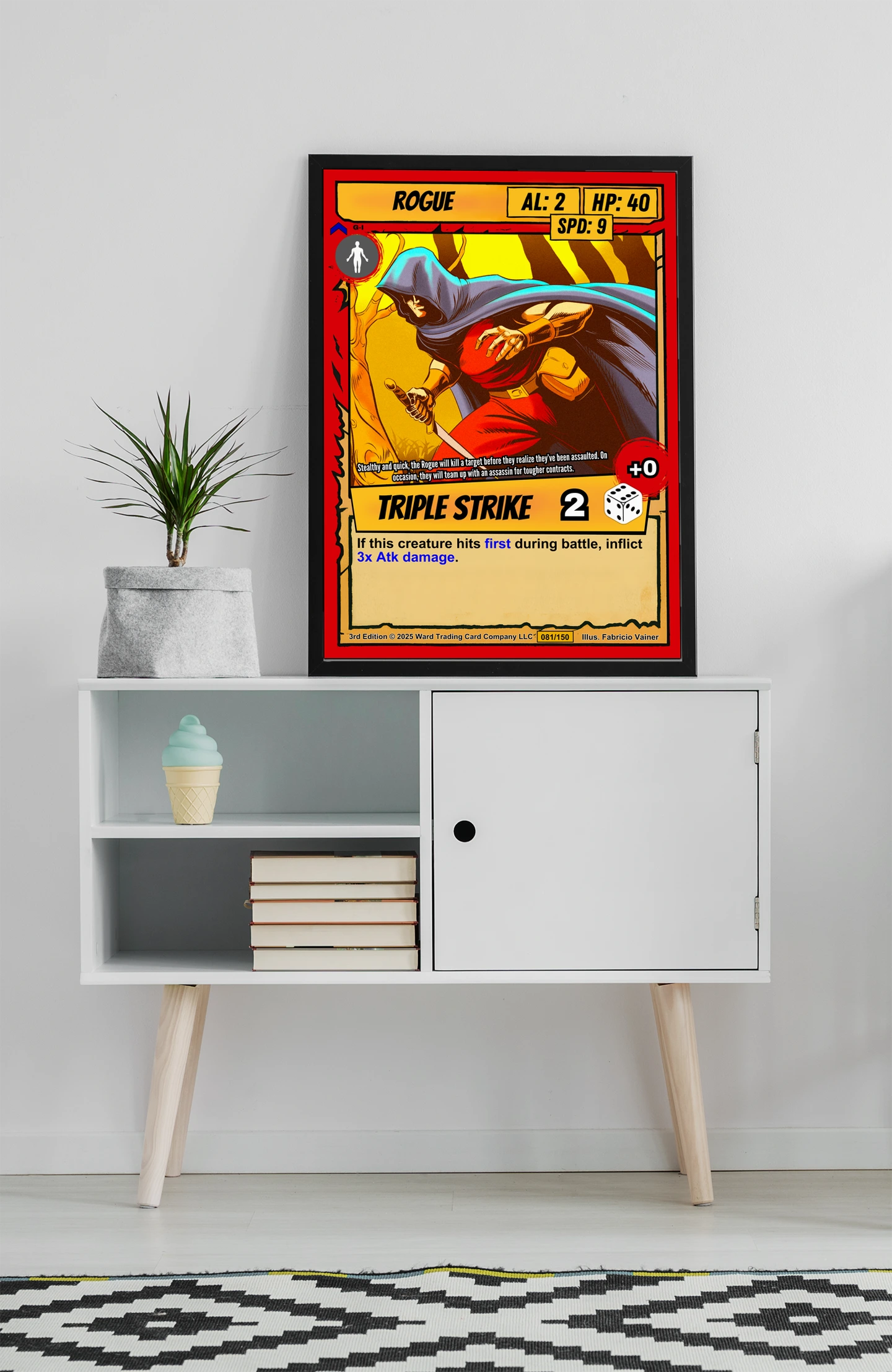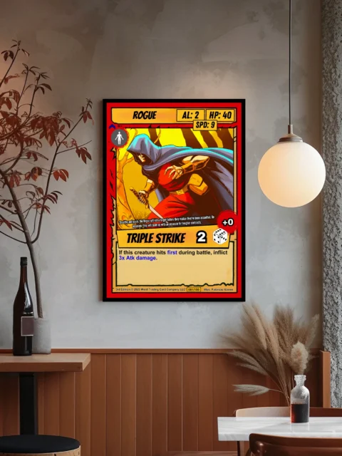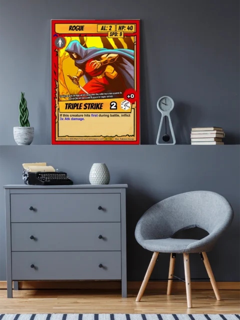 The Triple Strike ability text makes this more than character art. TCG collectors recognize the tactical value behind the artwork. Particularly, this rogue trading card canvas print speaks to players who appreciate game mechanics.