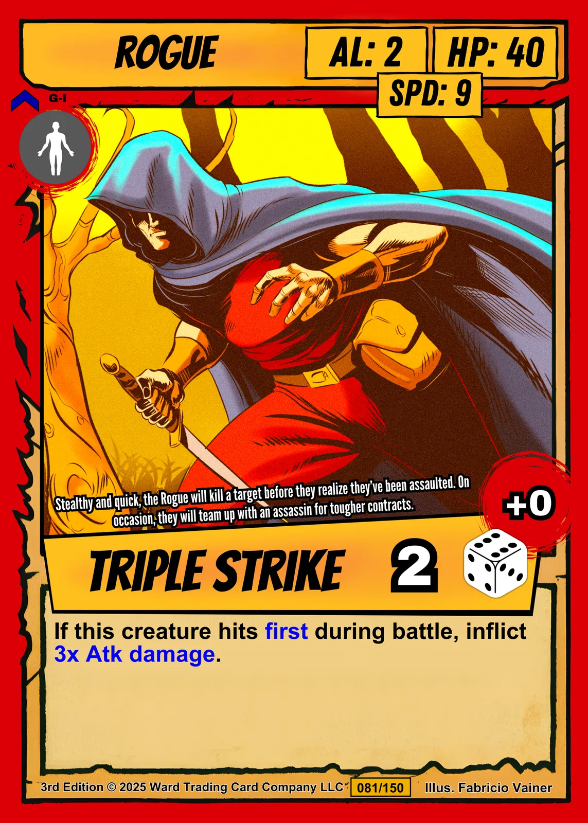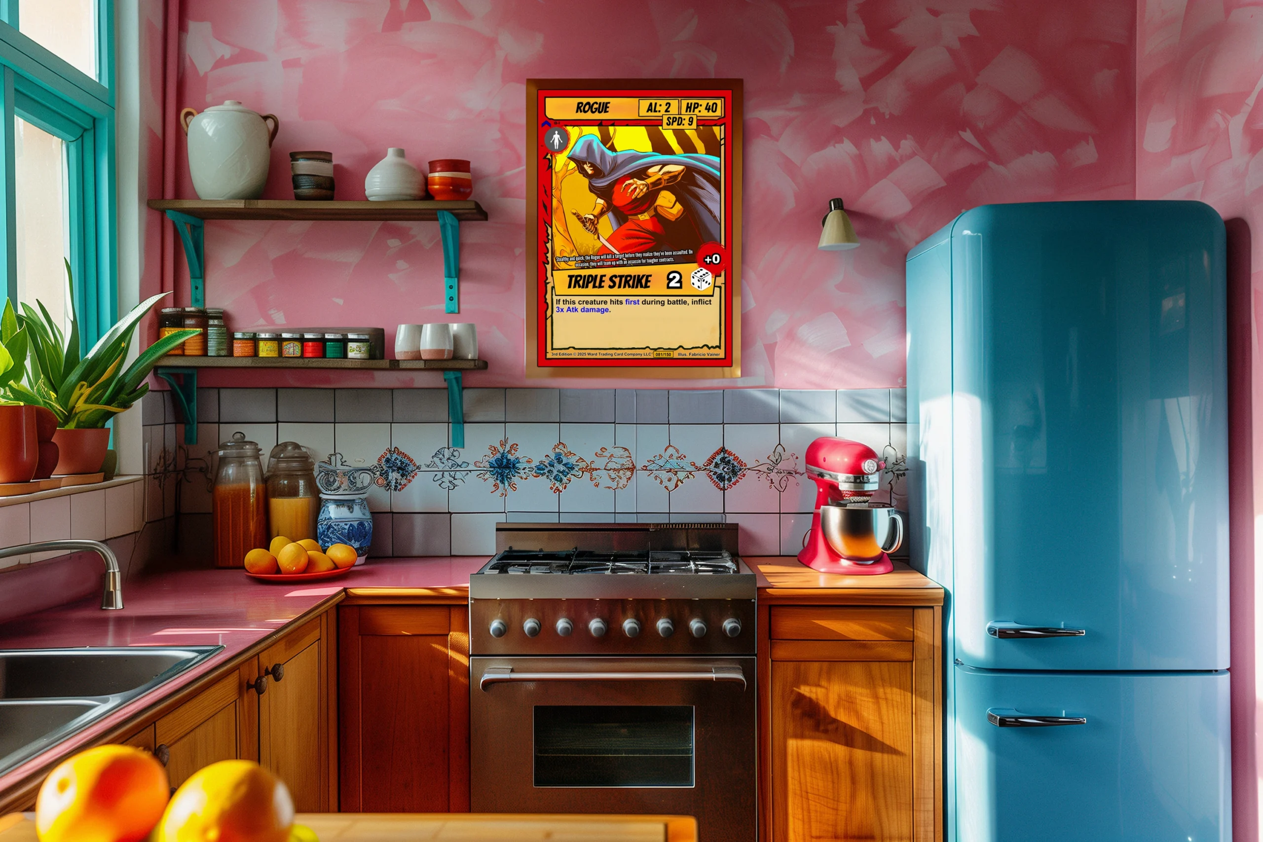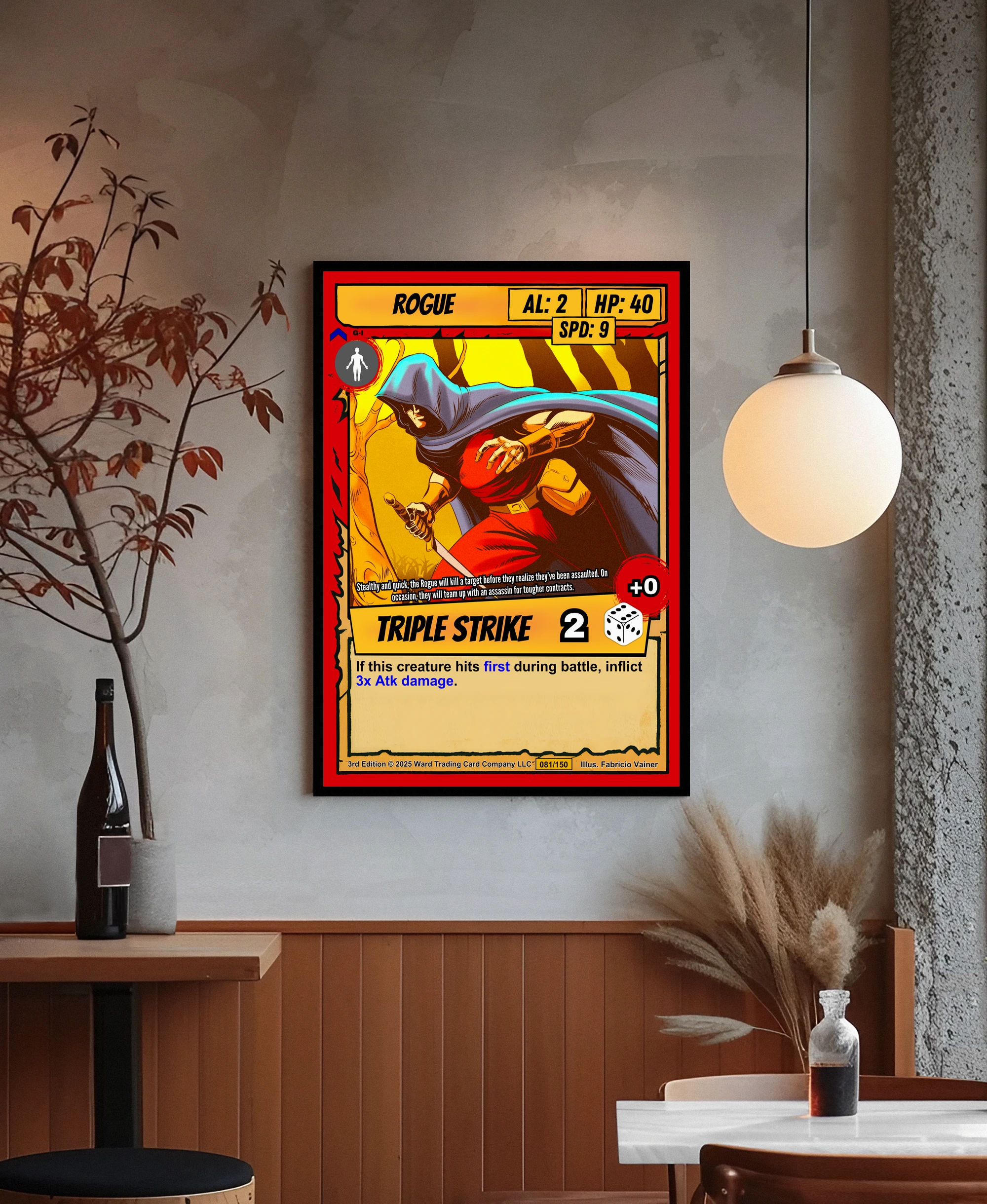 The Triple Strike ability text makes this more than character art. TCG collectors recognize the tactical value behind the artwork. Particularly, this rogue trading card canvas print speaks to players who appreciate game mechanics.