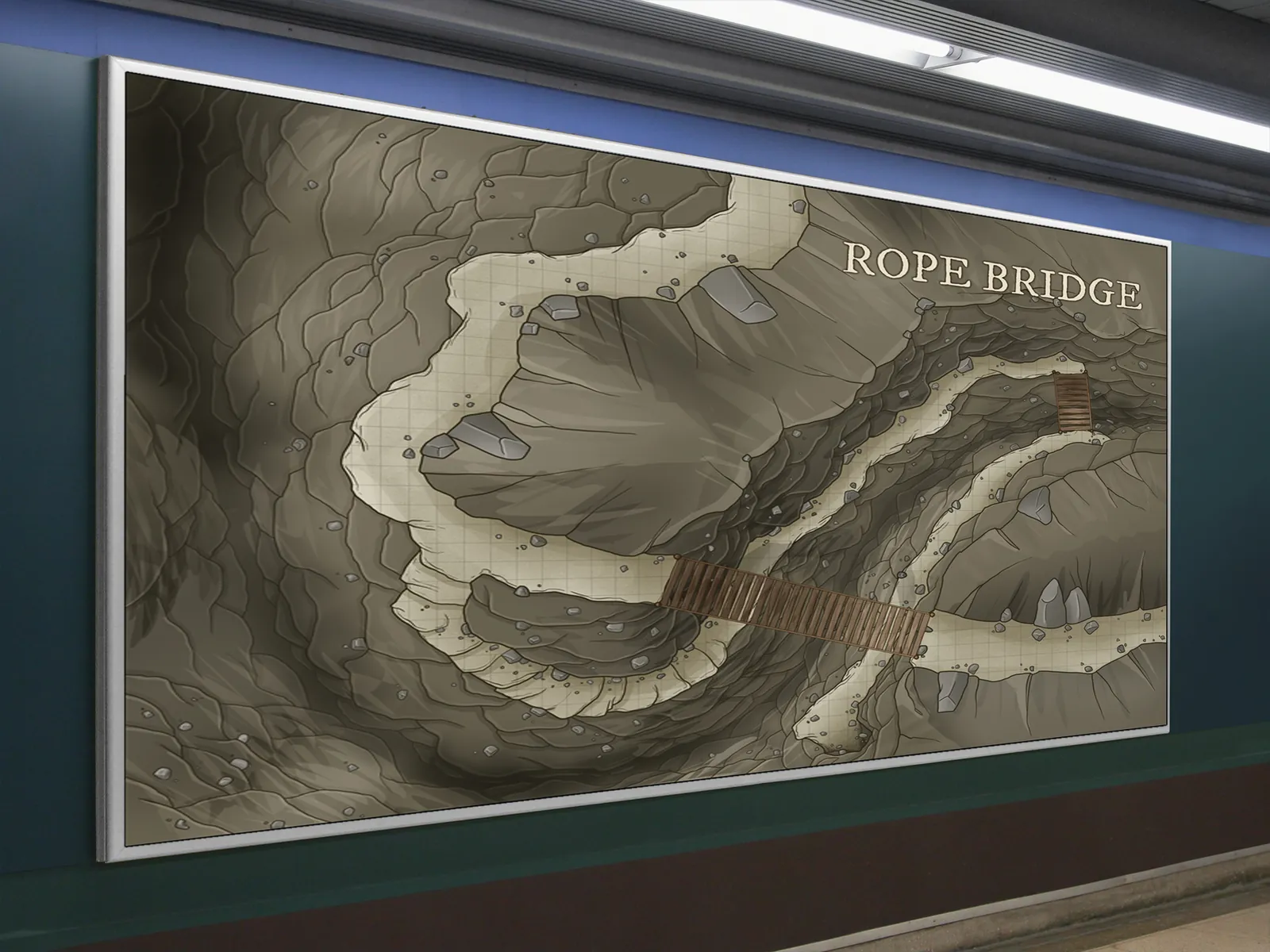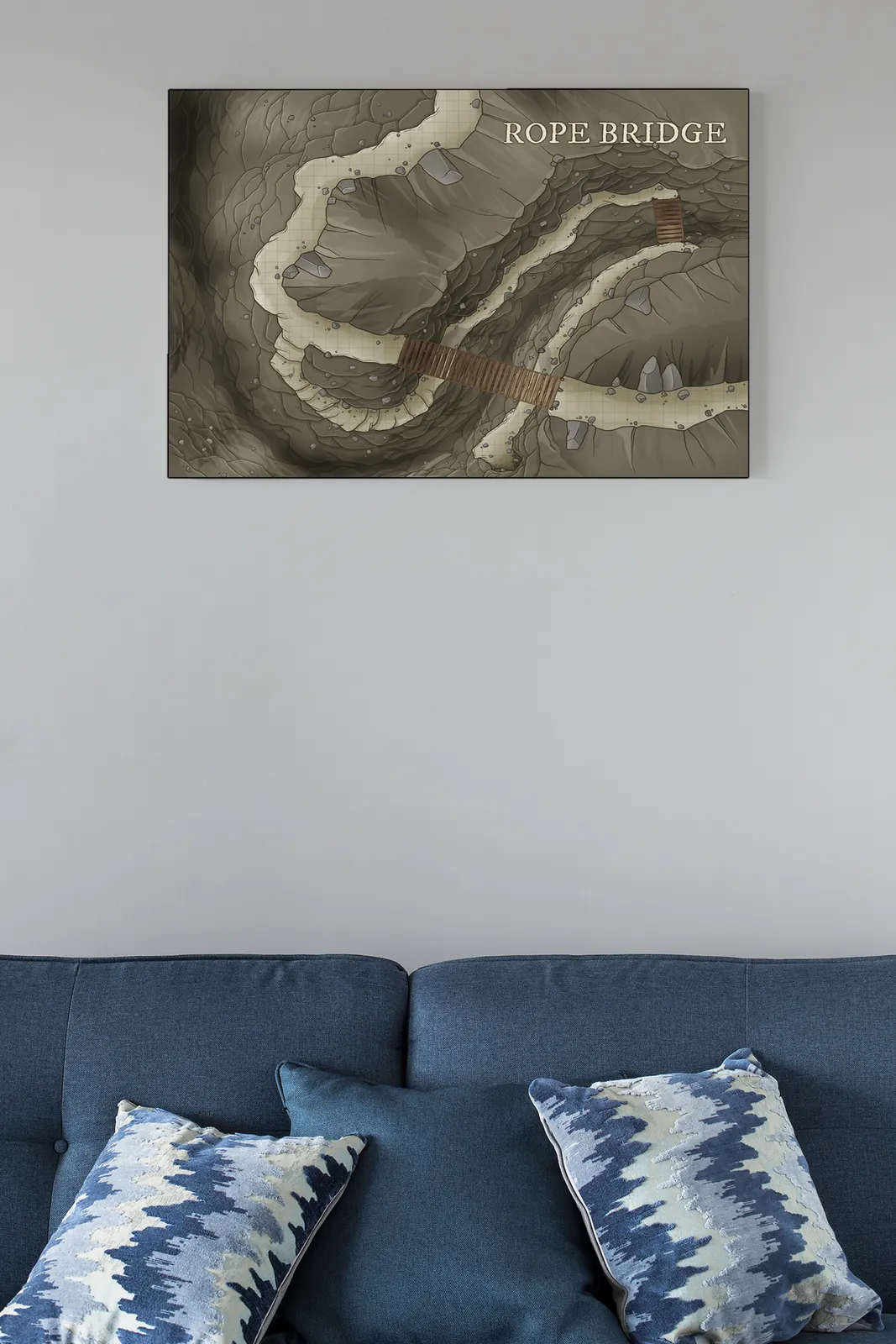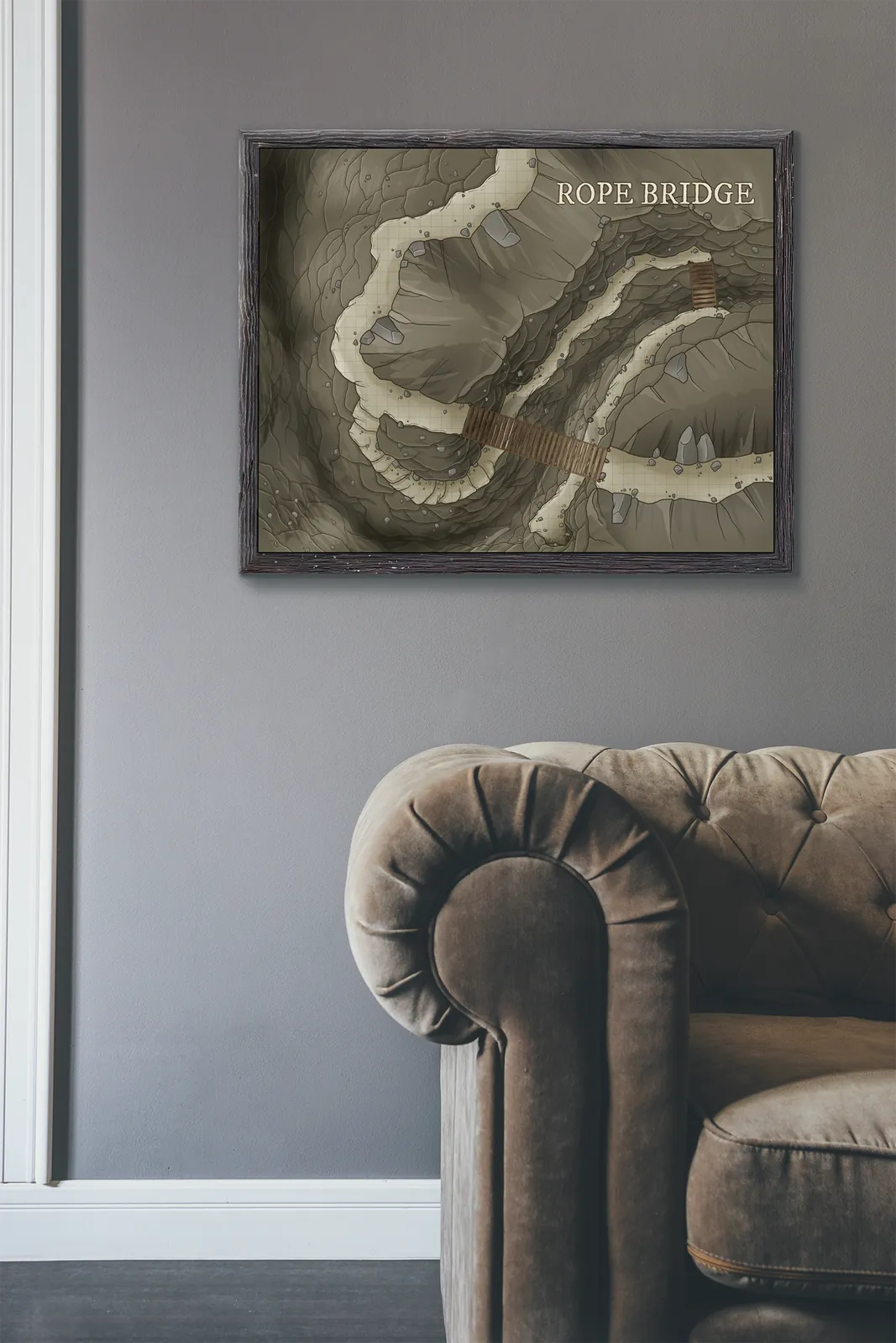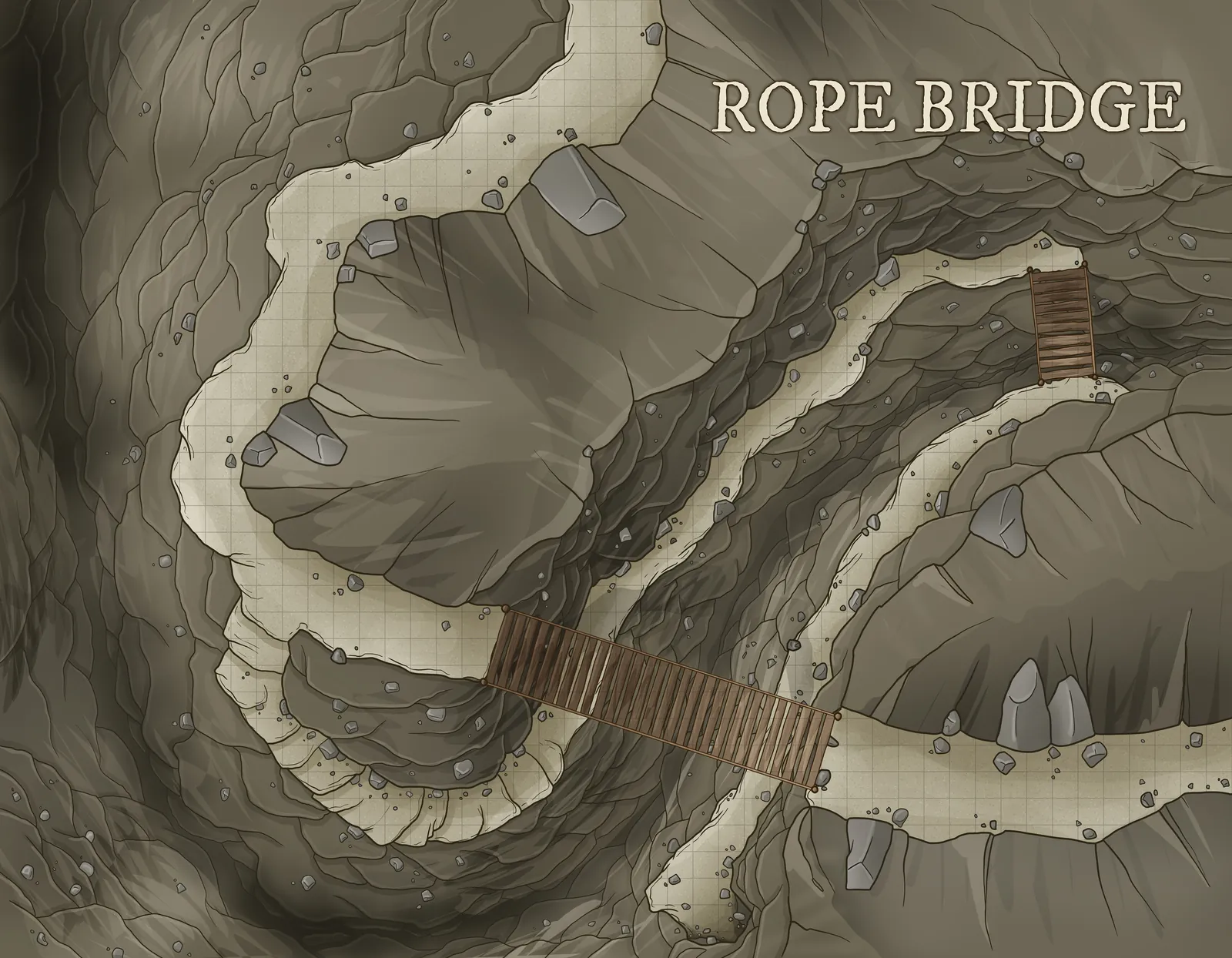 The Rope Bridge Fantasy Map presents a narrow crossing suspended over a steep mountain ravine, viewed from above for clear tactical play. Winding cliffside paths, exposed rock faces, and the fragile bridge itself immediately establish danger and vertical tension. As a result, the setting feels precarious and forces careful movement and decision-making.