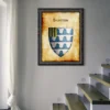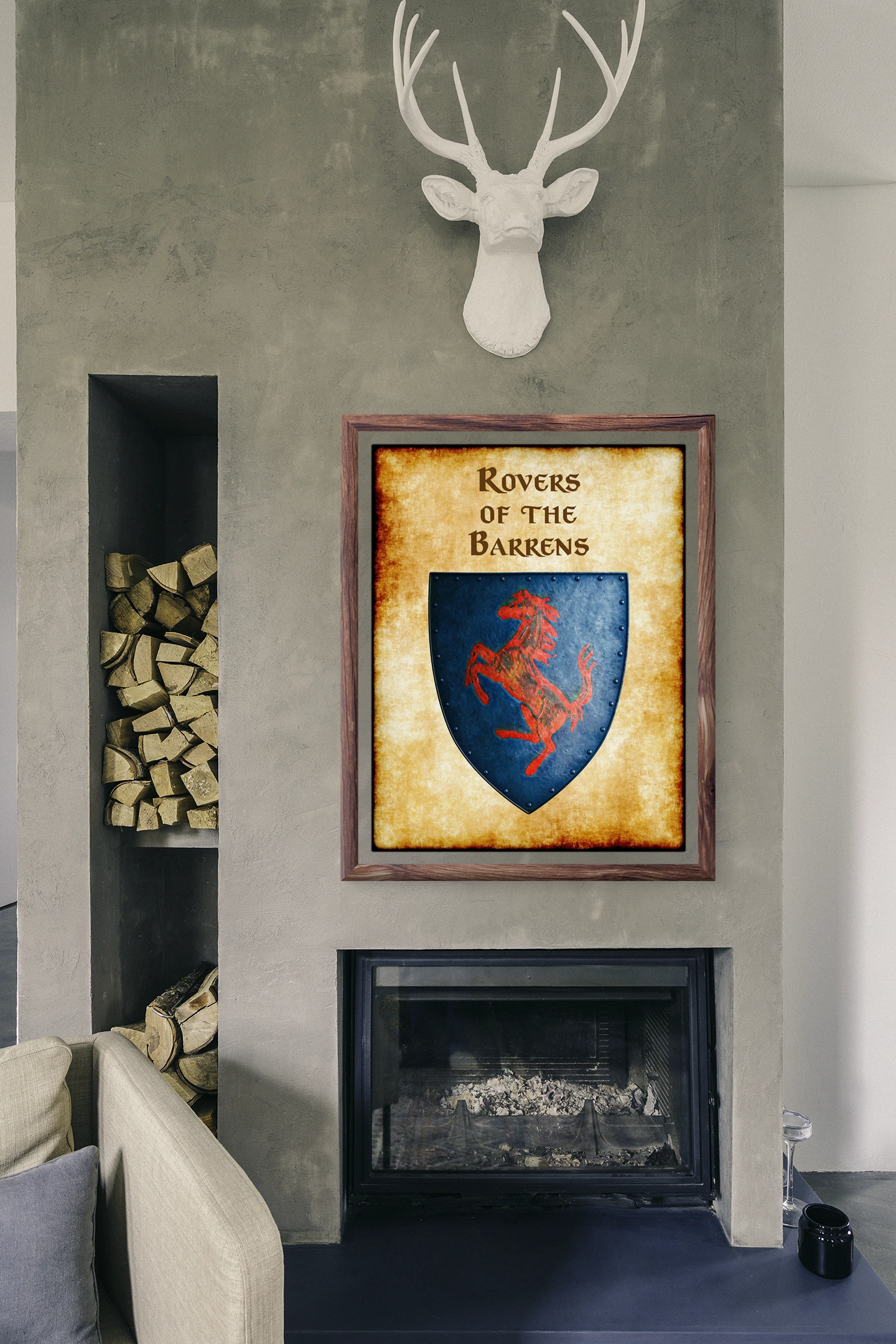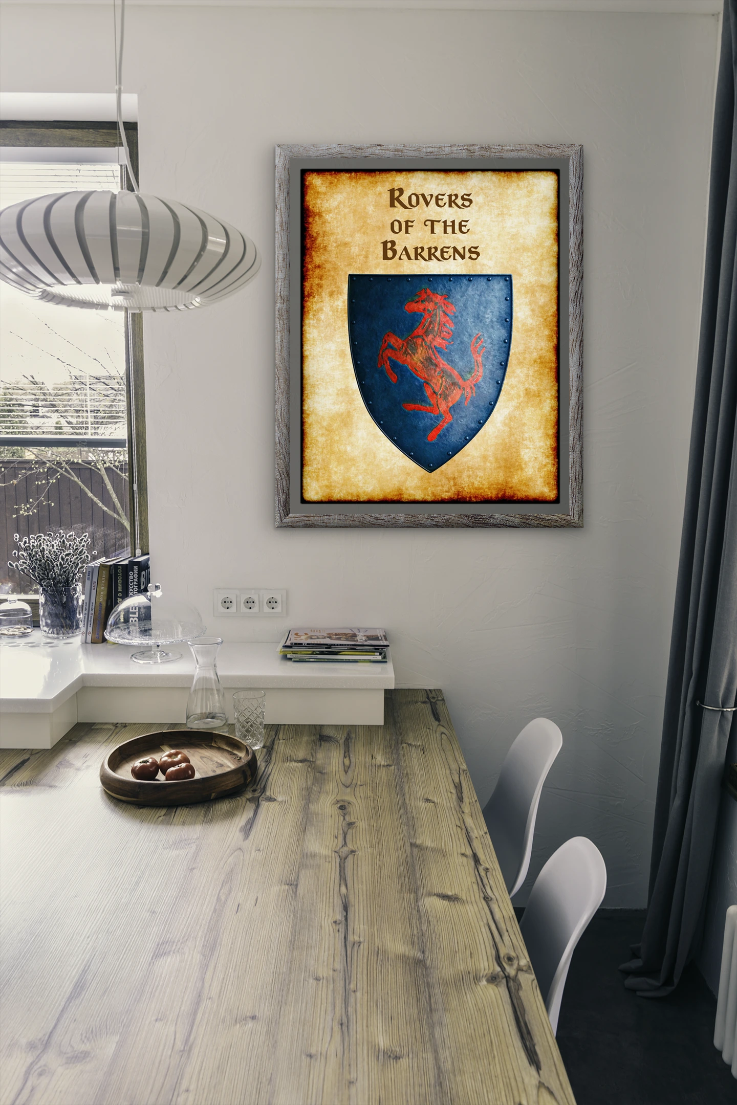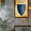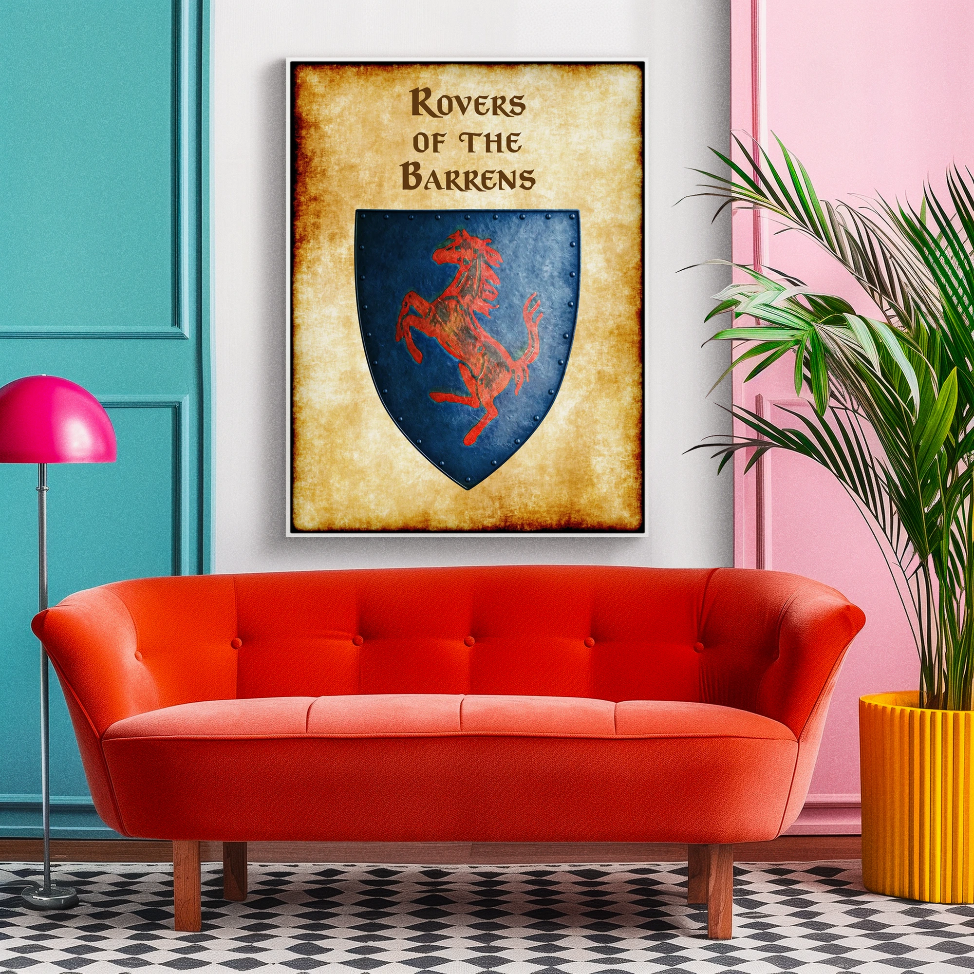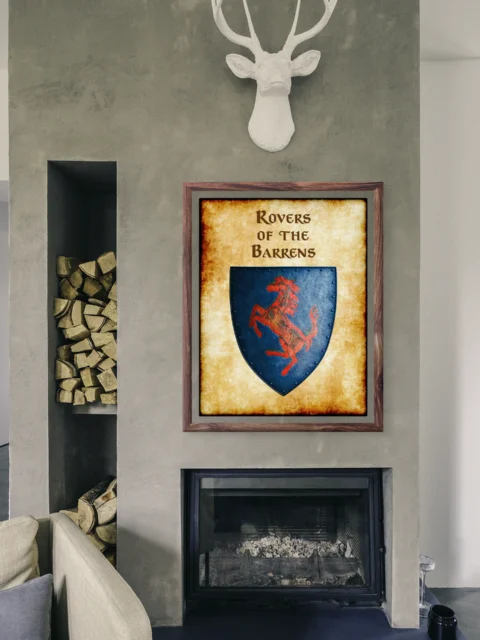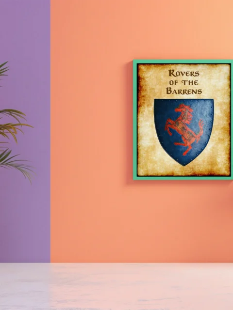 A red rampant horse charges across a weathered blue heraldic shield. This rovers of the barrens Greyhawk heraldry canvas print displays the nomadic horsemen’s faction symbol. Notably, aged parchment borders frame the riveted shield with battle-worn authenticity.