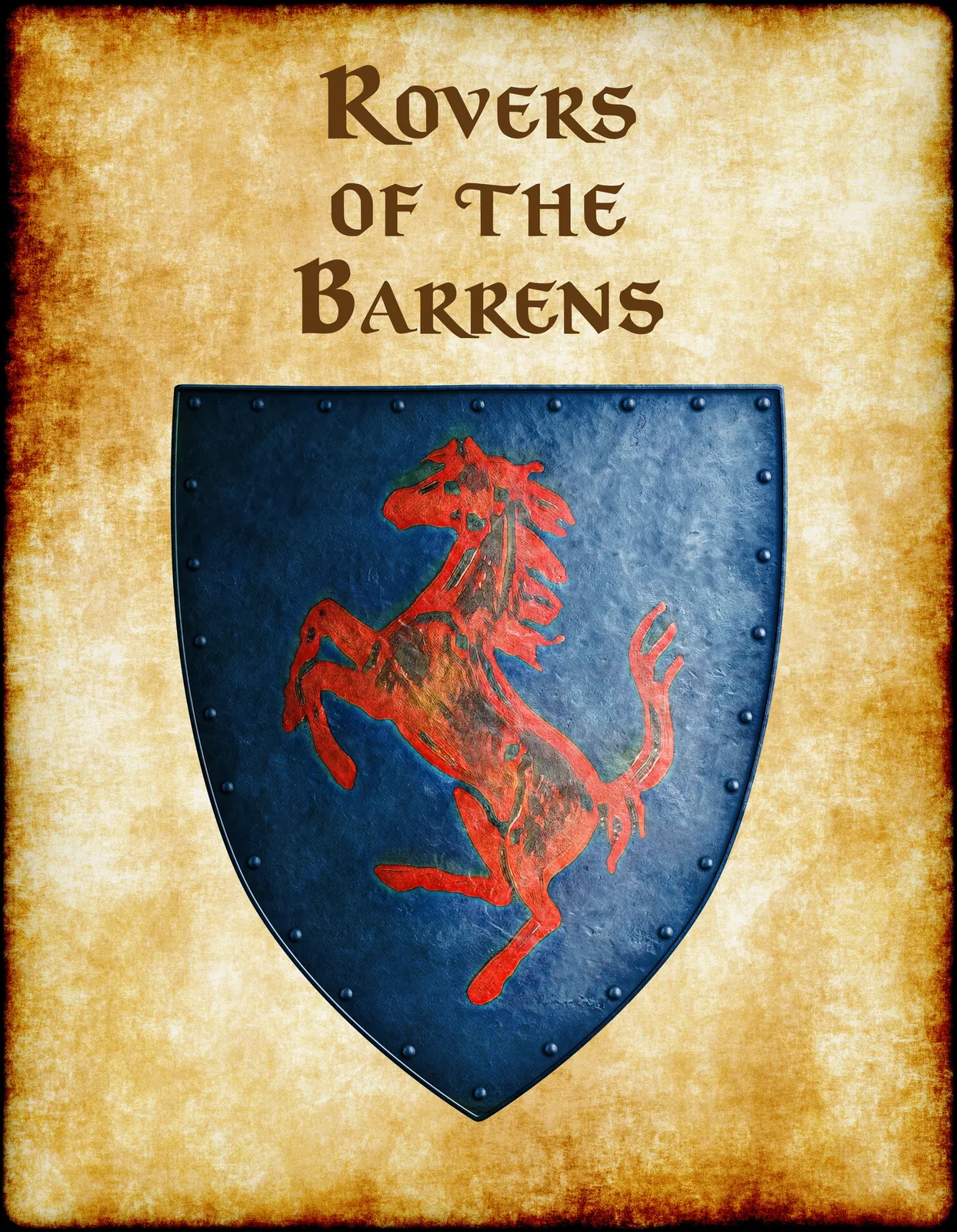 Moreover, deep blue tinctures contrast sharply against the crimson horse charge. The parchment background shows centuries of weathering through mottled browns and darkened edges. Indeed, metal rivets around the shield’s perimeter suggest countless campaigns across the Barrens.