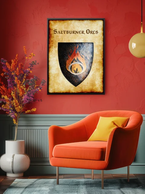 A black shield bears the flame device of the Saltburner Orcs. This saltburner orcs Greyhawk heraldry canvas print displays weathered medieval styling. Notably, riveted edges frame the fierce gradient fire symbol.