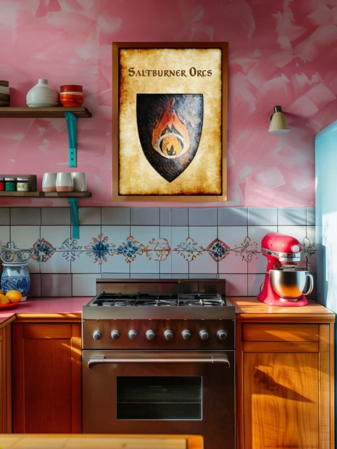 Creative studio or gaming den walls benefit from this orcish heraldry. Moreover, the weathered aesthetic complements fantasy campaign materials perfectly.