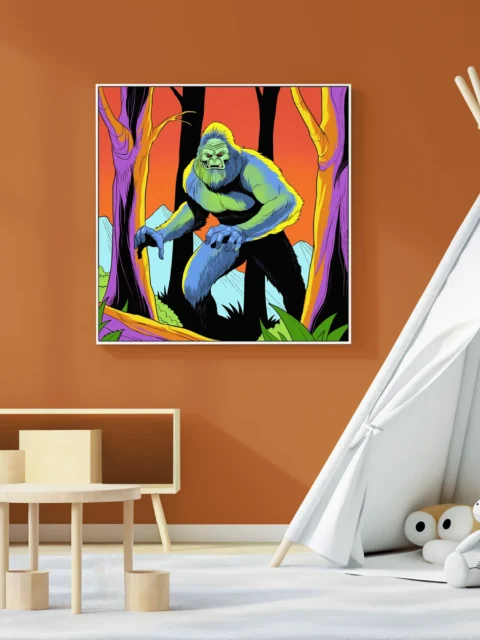 On the wall, the creature’s scale and color saturation deliver genuine menace. This print serves Ward TCG collectors and cryptid art enthusiasts who want retro-horror illustration. The sasquatch art trading card art canvas print transforms Vainer’s work into gallery-ready display.
