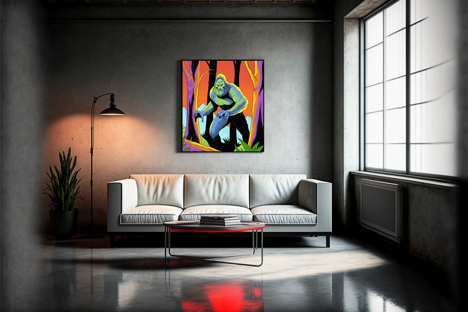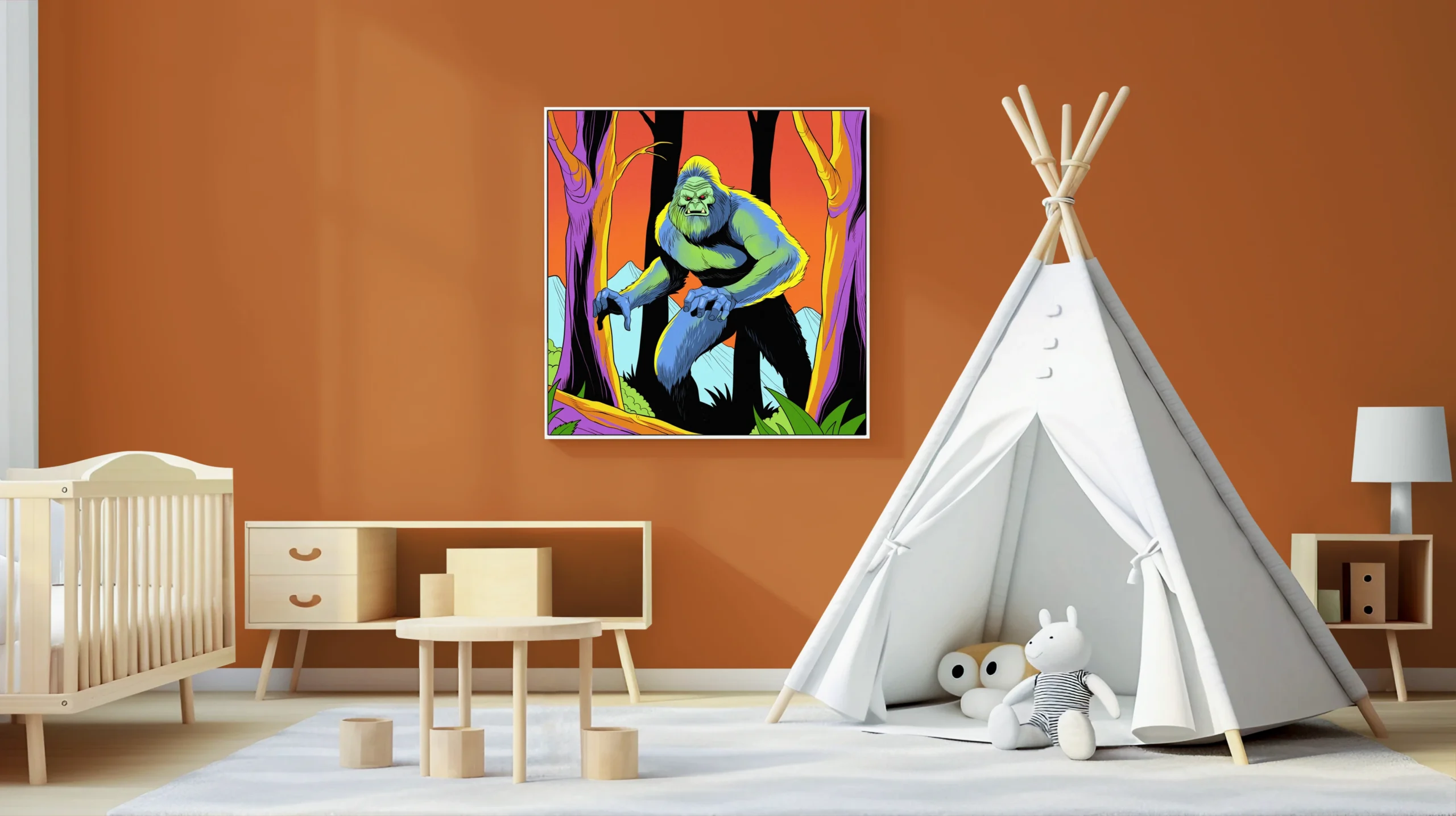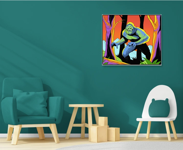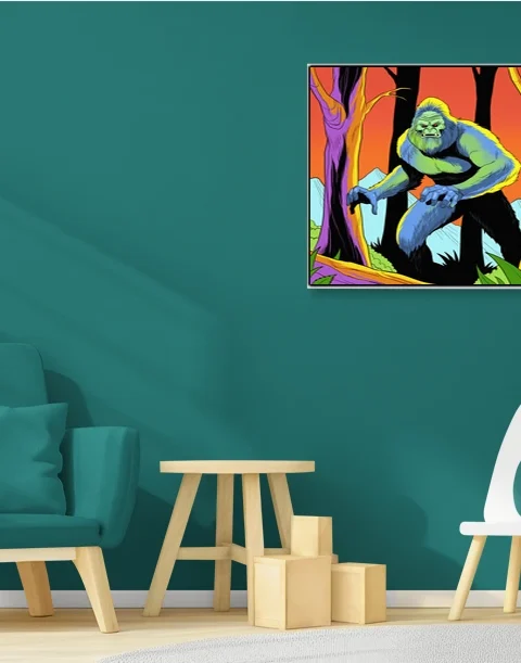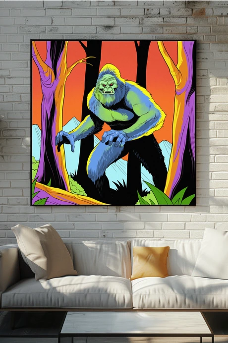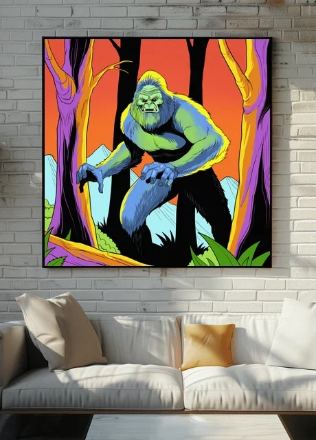 Display in game rooms where cryptid lore and retro comic aesthetics align with collector sensibilities. Additionally, the psychedelic color scheme fits creative studios seeking bold creature art with vintage appeal.