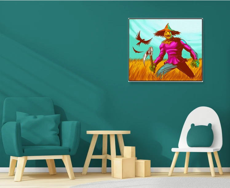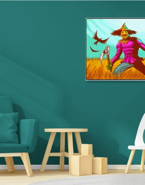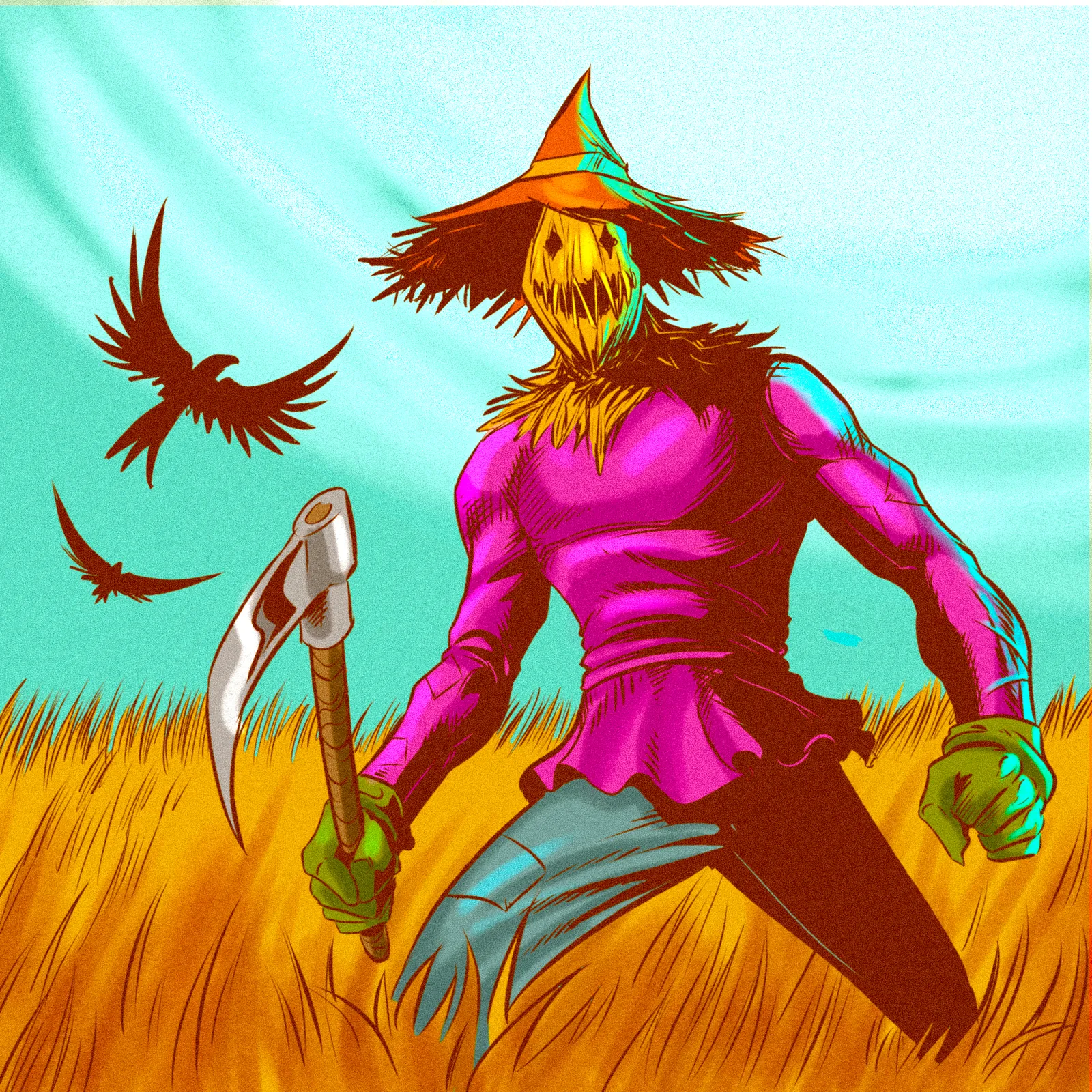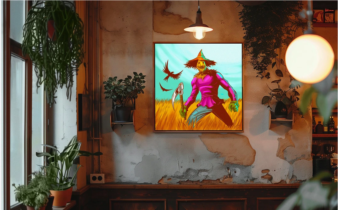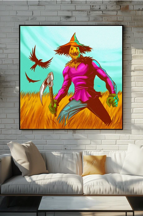 A muscular scarecrow figure with a jack-o-lantern head stands sickle-ready in wheat. This scarecrow art trading card art canvas print showcases Fabricio Vainer’s illustration at full scale. Notably, the hot pink shirt against golden wheat creates jarring chromatic tension.
