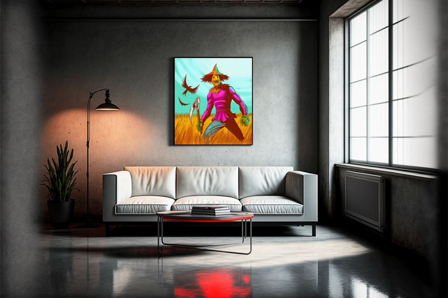On the wall, the complementary orange-teal palette holds intensity that card scale cannot. Ward TCG collectors and Halloween art enthusiasts gain a menacing seasonal anchor piece. This scarecrow art trading card art canvas print delivers year-round horror without holiday kitsch.
